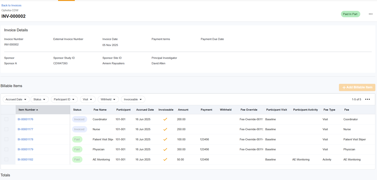 Въпреки че SiteVault предоставя подробни фактурируеми елементи, спонсорите често изискват фактурите да бъдат групирани (напр. по пациент, по посещение или като обобщение). Използвайте функцията за експортиране, за да манипулирате данните, за да отговаряте на специфичните за спонсора изисквания за фактуриране.