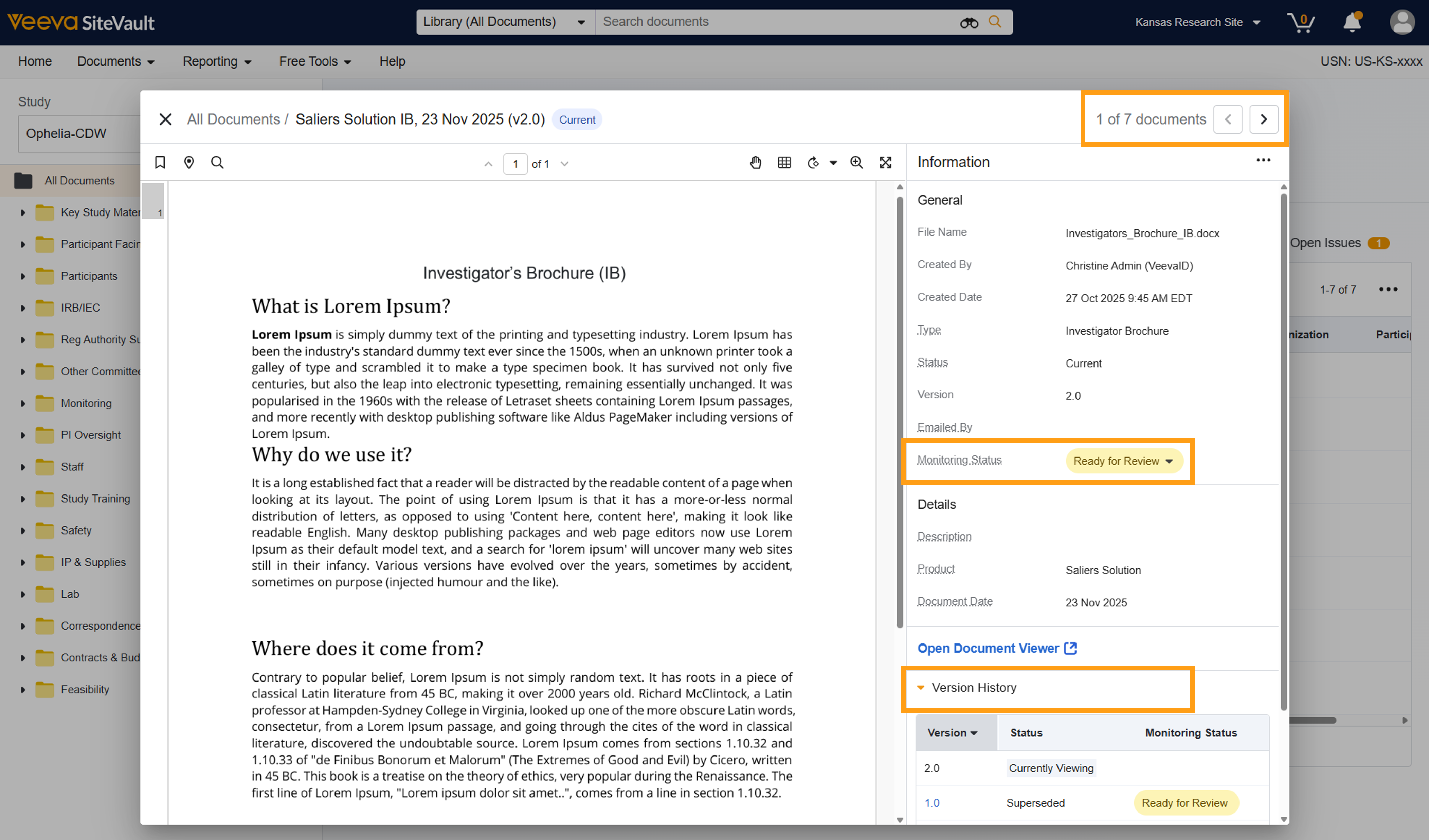 Alle Dokumente befinden sich standardmäßig im Status „Bereit zur Überprüfung“. Dokumente mit neuen Versionen beginnen ebenfalls im Status „Bereit zur Überprüfung“. Daher hat jede Version eines Dokuments im Status „Bereit zur Überprüfung“ eine eigene Zeile in der Liste. Durch Auswahl eines Dokuments wird dieses im Monitoring eBinder Document Viewer zur