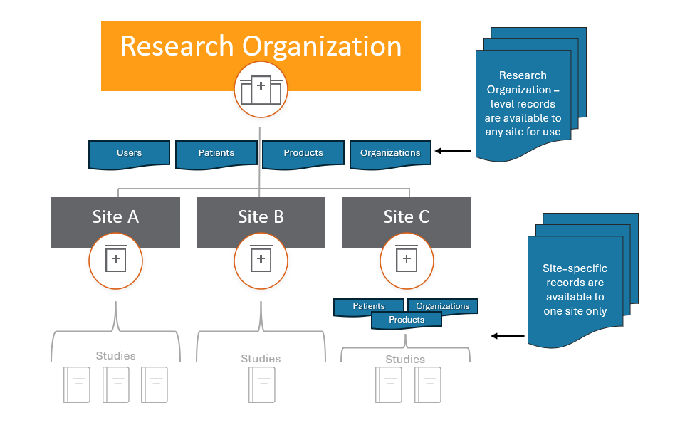 SiteVault ist so konzipiert, dass es sowohl einzelnen Prüfzentrum, die ein Tool zur Organisation ihrer Studienmaterialien suchen, als auch größeren Organisationen mit mehreren SiteVault Umgebungen gerecht wird. Forschungseinrichtungen verfügen über mehrere Prüfzentren (oder Abteilungen/Bereiche), die jeweils eigene SiteVault Umgebungen verwalten, welche wiederum von der SiteVault der Organisation überwacht werden. Benutzer haben Systemrollen auf Ebene der Forschungseinrichtung und der Prüfzentrum. Benutzer, die Zugriff auf mehrere Prüfzentren benötigen, können an den verschiedenen Prüfzentren unterschiedliche Systemrollen haben.