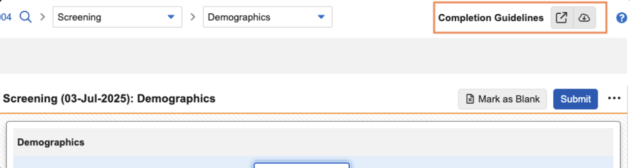 Sponsoren haben nun die Möglichkeit, Dateneingabeanweisungen sofort freizugeben, um die Nutzer der Prüfzentrum zu unterstützen. Die Nutzer können die Datei von jedem Bildschirm innerhalb der Studie aus in der oberen rechten Ecke aufrufen.