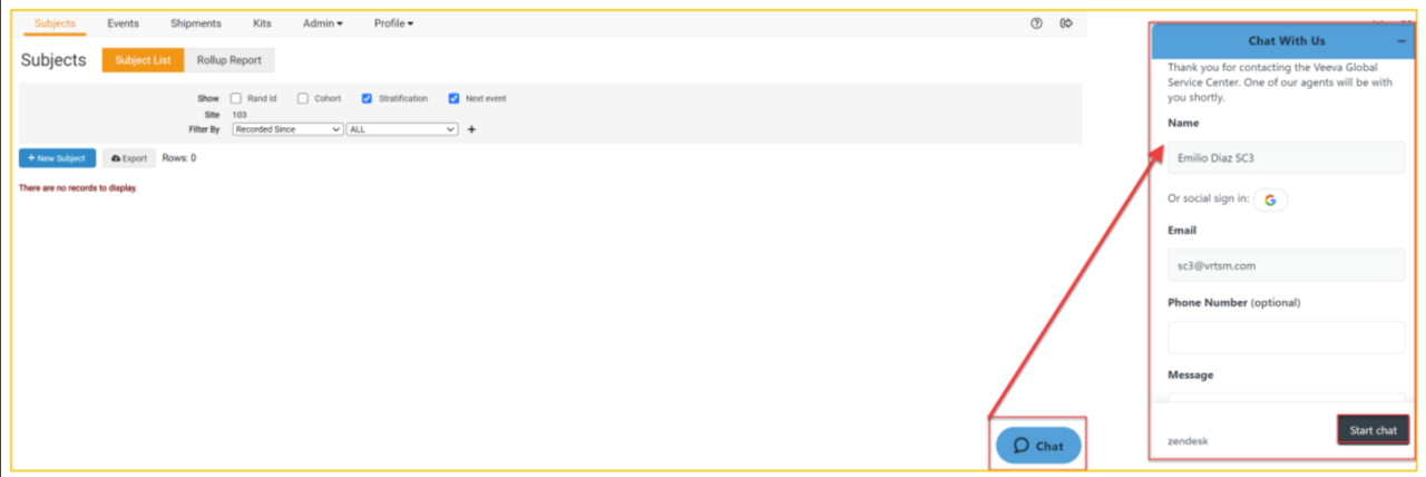 Une icône de chat bleue sera visible dans le coin inférieur droit de chaque page de l'étude RTSM.