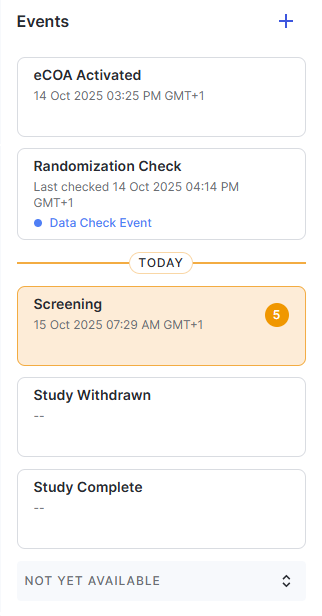 eCOA सक्रियित घटना शीर्ष पर सूचीबद्ध है, उसके बाद पिछले कार्यक्रम और आज के कार्यक्रम (इसके बगल में एक आइकन है जो आपको यह देखने में मदद करता है कि सूची में वर्तमान तिथि कहां है)।