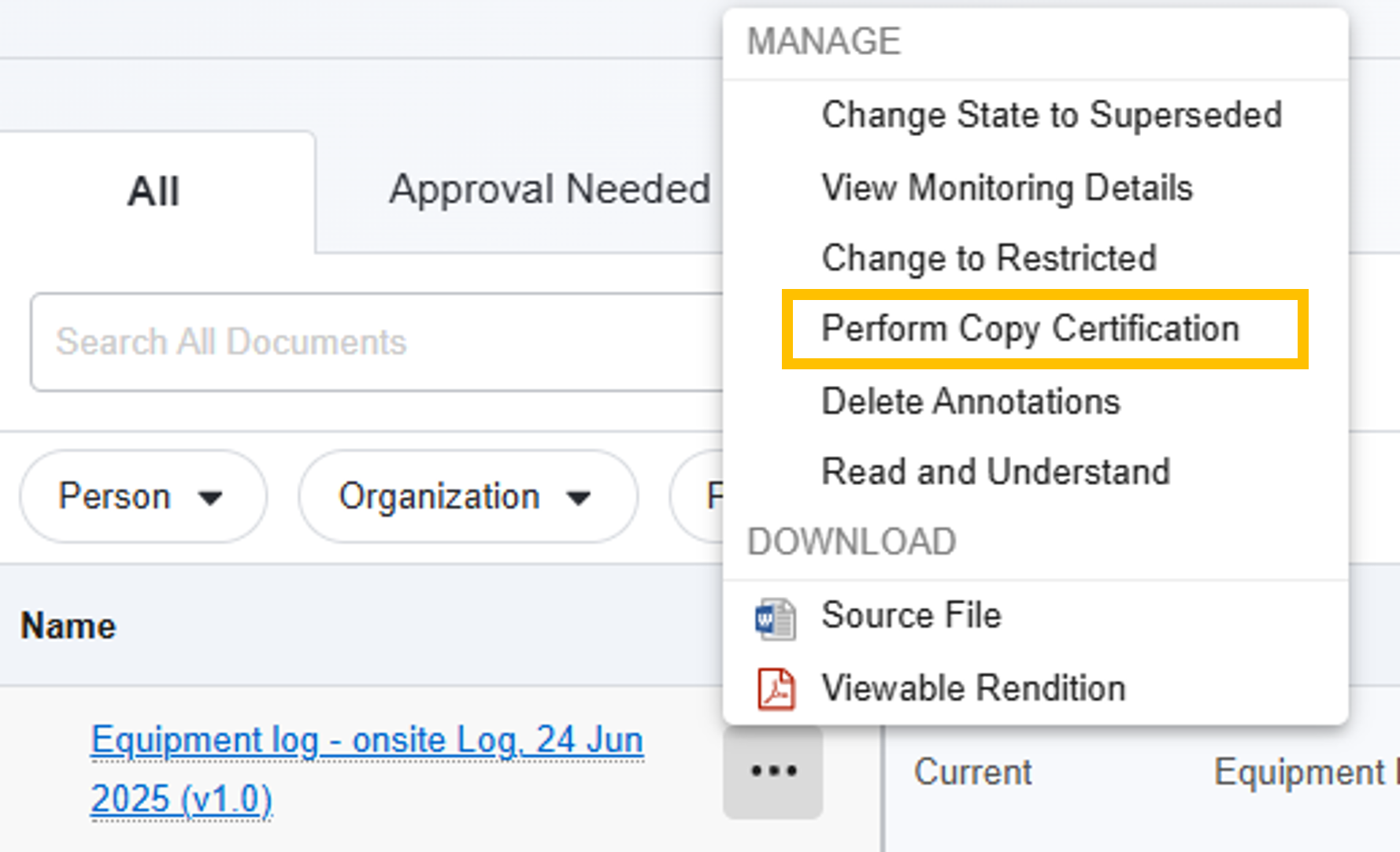 Utilizzare il campo "Copia certificata" per individuare i documenti classificati come copie certificate. Aggiungere la colonna "Copia certificata" alle tabelle "Libreria documenti" e "eBinder" (menu "Tutte le azioni" > "Modifica colonne"). Le copie certificate avranno un valore "Sì" o "Vero" nel campo "Copia certificata", a seconda di dove si sta effettuando la ricerca.