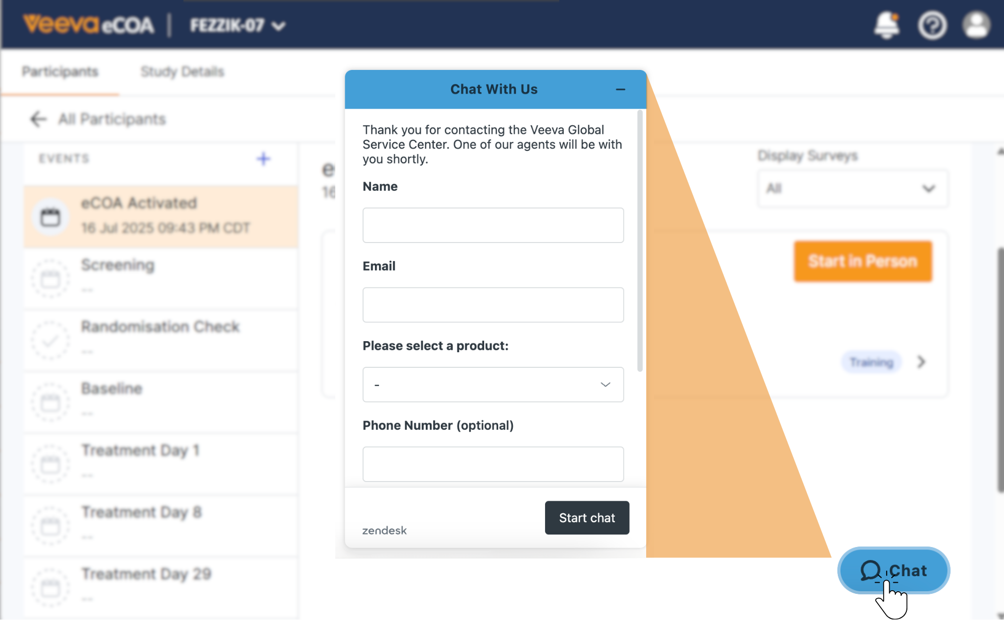 Veeva eCOAの各ページにチャットボタンが表示されます。ご質問やサポートが必要な場合は、ボタンを選択してVeevaサポートにお問い合わせください。サポートを受けるために、作業中の作業を終了する必要はありません。