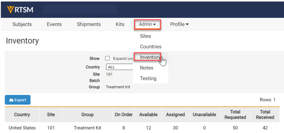 ブラインドインベントリ RTSMでブラインド在庫を表示する 「管理」タブ にマウスを移動し、ドロップダウン メニューから 「在庫」 を選択します。 施設のすべてのキットのブラインドビューが表示されます。 注: 試験では上記に表示されているタブとは異なる場合があります。 ← FTPアクセス要件 はじめにホーム →