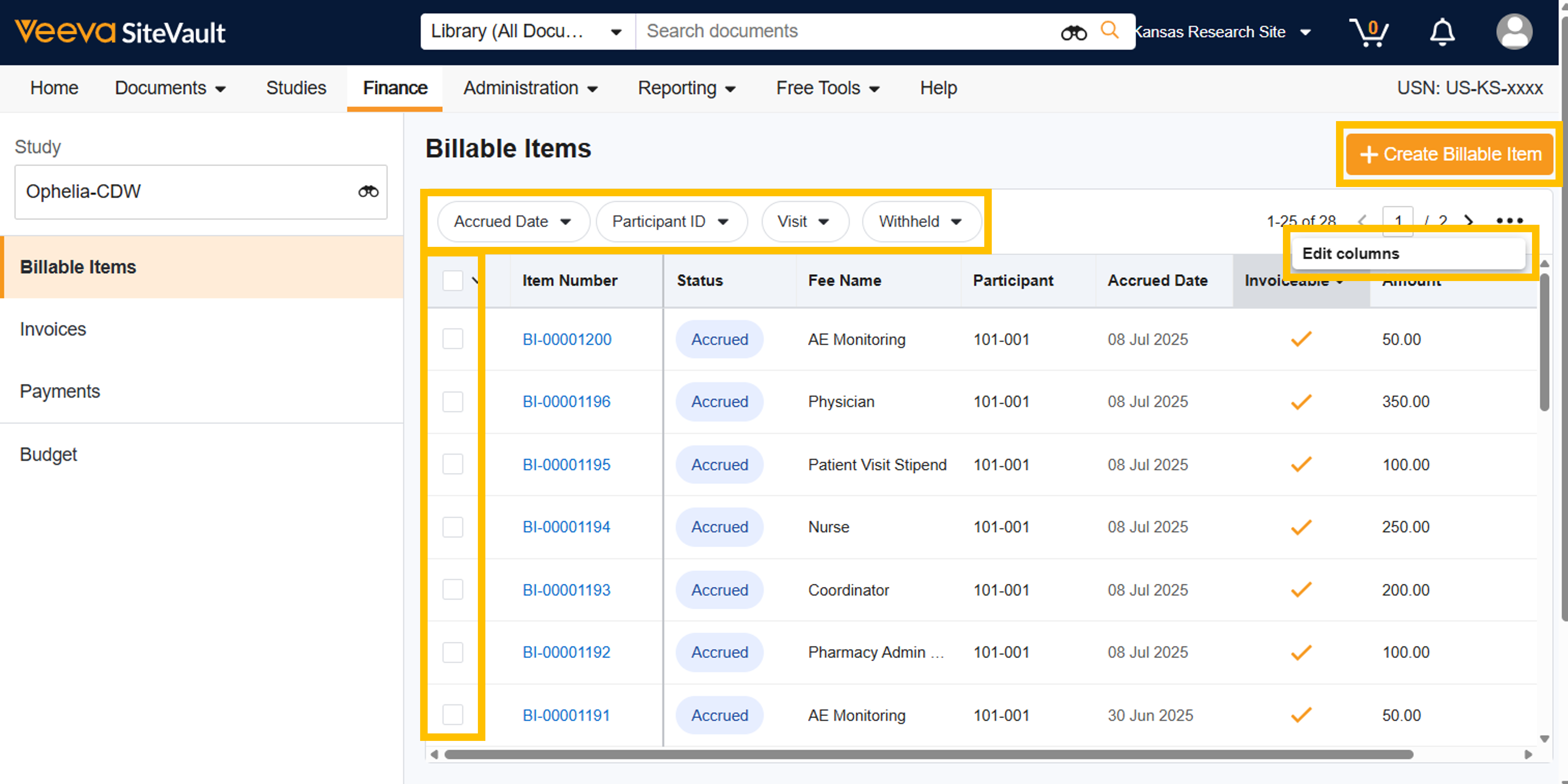 注: 新しい財務タブ ( CTMS情報が管理される場所) はすべてのSiteVaultユーザーに表示されますが、 CTMSは現在早期導入者のみが利用できます。