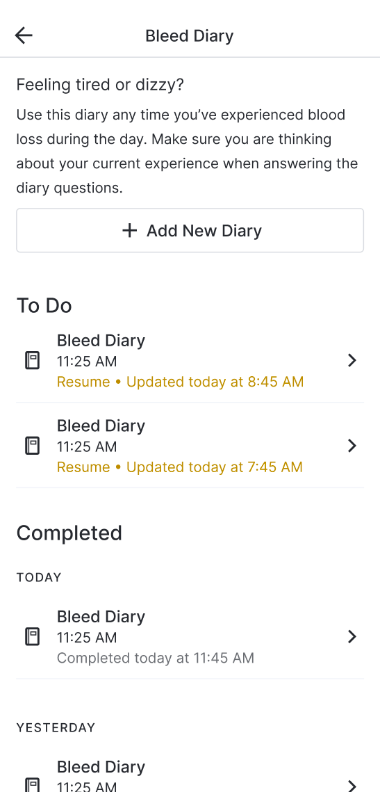 연구 구성에 따라 사용자는 완료된 설문 조사 일지 항목을 볼 수 있습니다. 단, 완료된 설문 조사를 볼 때는 선택 사항을 변경할 수 없습니다.
