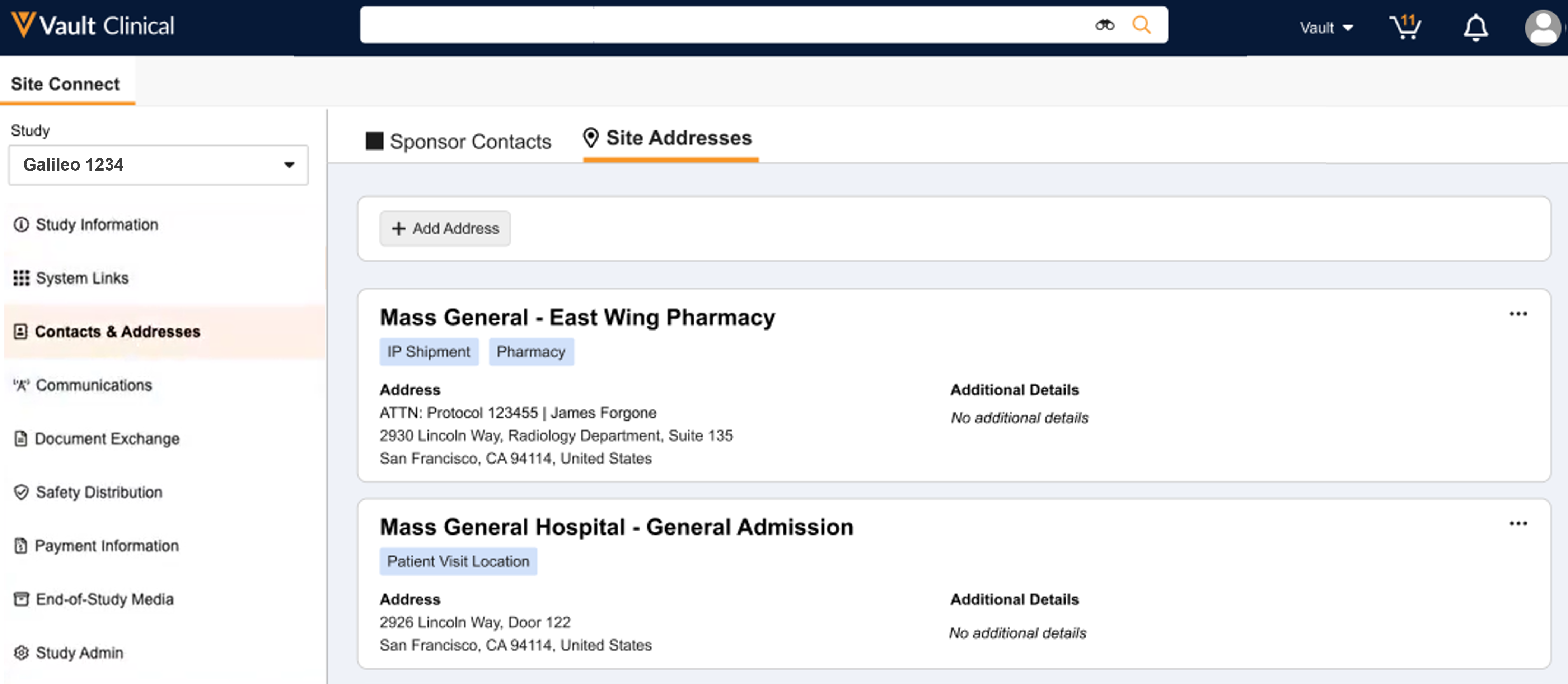 나중에 사용할 수 있도록 주소를 저장하도록 선택하면 해당 주소가 사이트의 USN과 연결되고 연구 관리자의 사이트 주소 목록에 저장됩니다. 최대 200개의 주소를 저장할 수 있어 여러 연구에서 주소를 재사용하는 것이 간편해집니다.