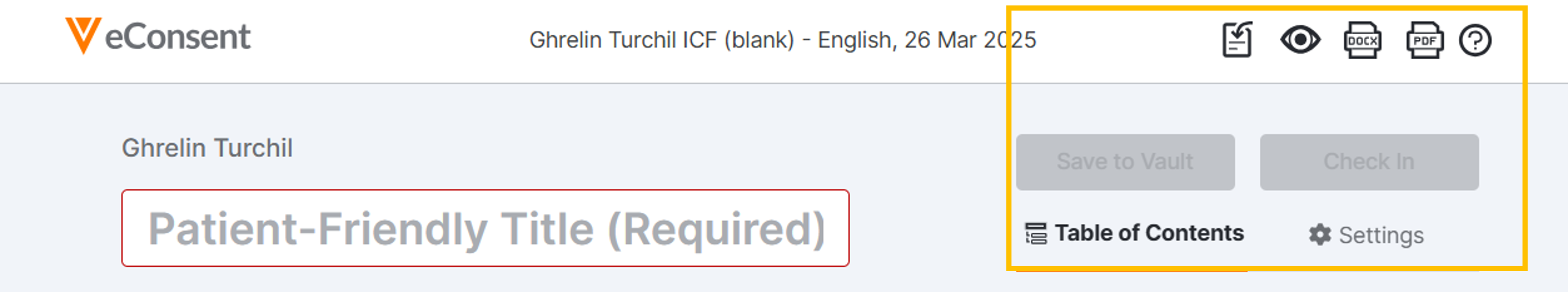 - 제목은 SiteVault 의 필드에 저장되지 않습니다. 참여자에게 보낼 ICF 선택할 때 참여자에게 친숙한 제목을 보려면 문서의 설명 문서 필드에 제목을 추가하세요.