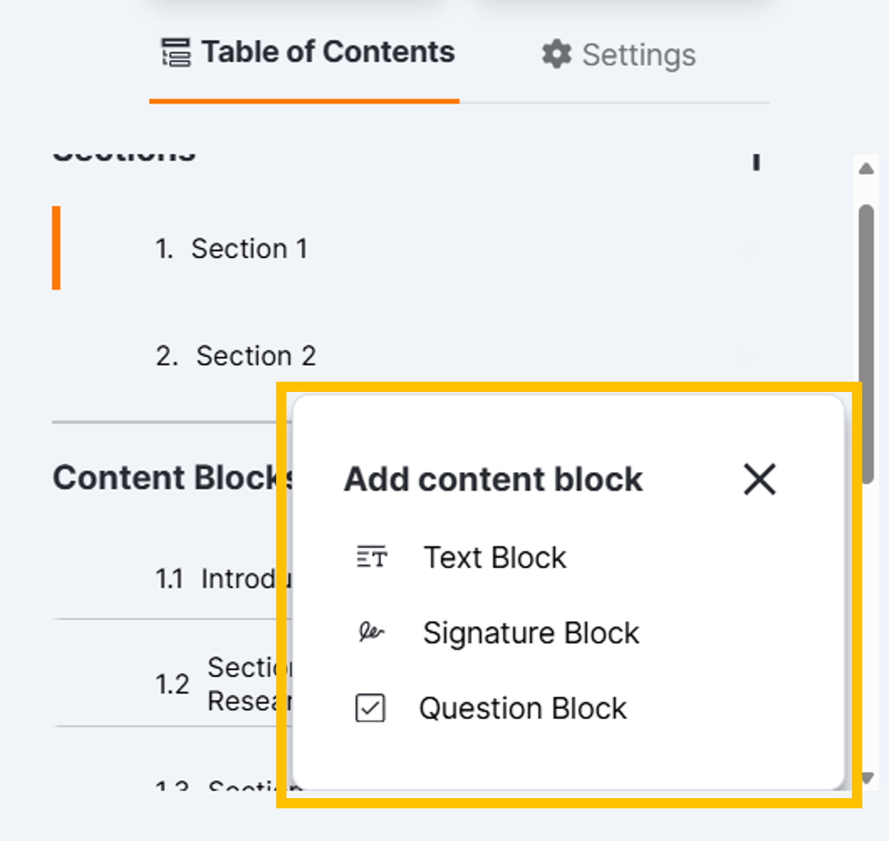 - 콘텐츠 블록을 추가하려는 섹션을 보면서 콘텐츠 블록 +을 선택하고 적절한 유형을 선택하세요.
