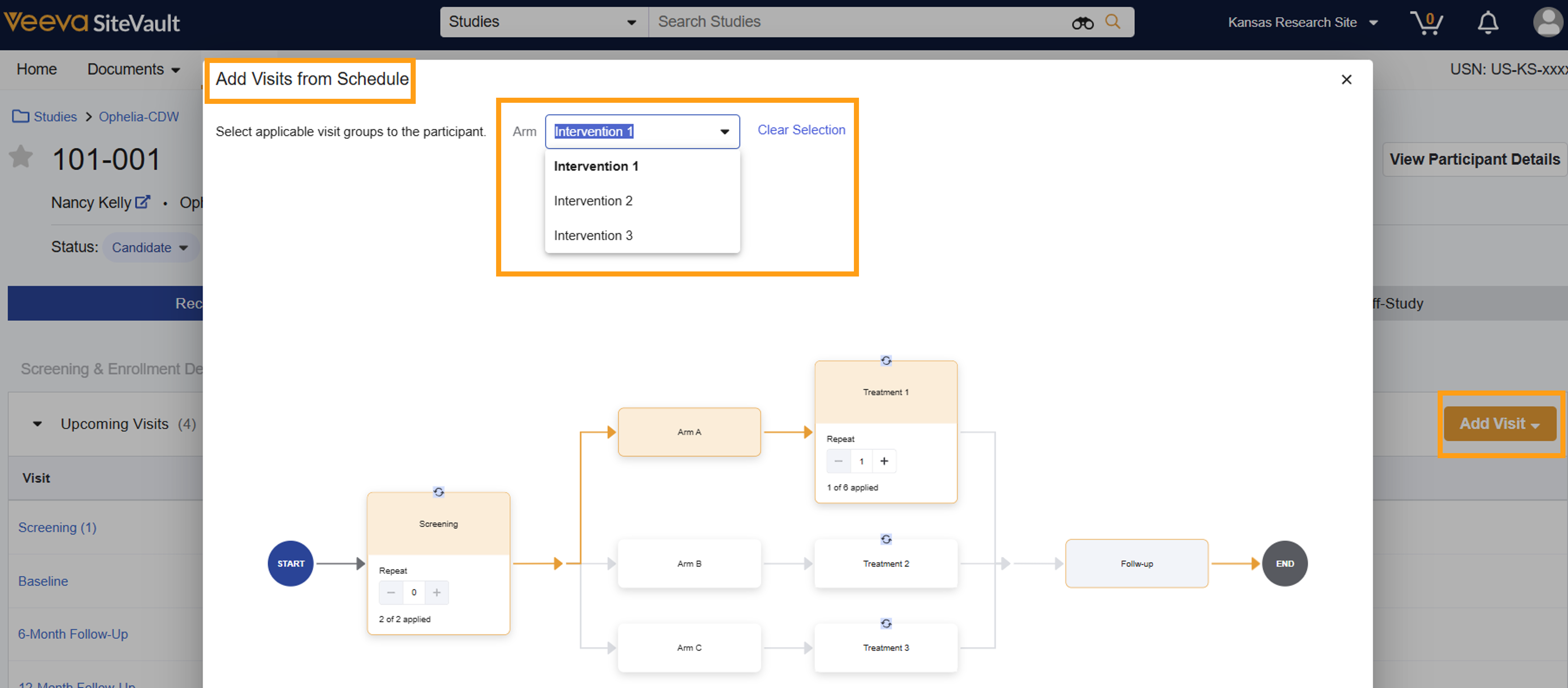 Bij het toevoegen van deelnemersbezoeken kunt u de betreffende arm specificeren voor een eenvoudigere selectie.