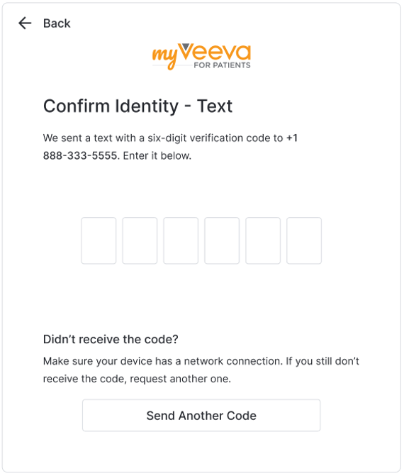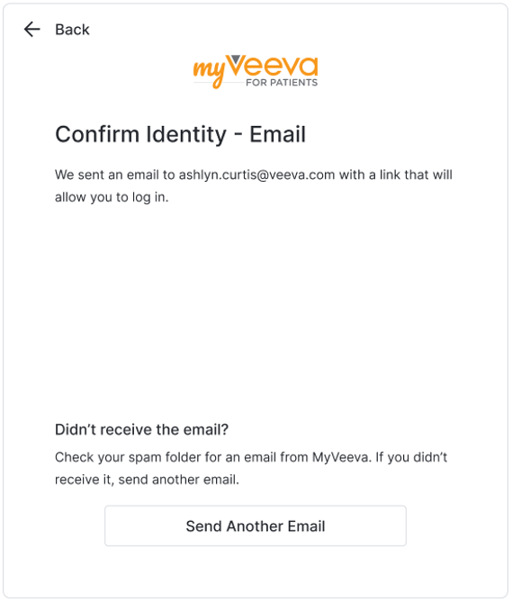 Sprawdź swoją skrzynkę e-mail, aby znaleźć link i wybierz go. Jeśli weryfikacja zakończy się pomyślnie, w aplikacji MyVeeva for Patients pojawi się komunikat „Tożsamość potwierdzona”.