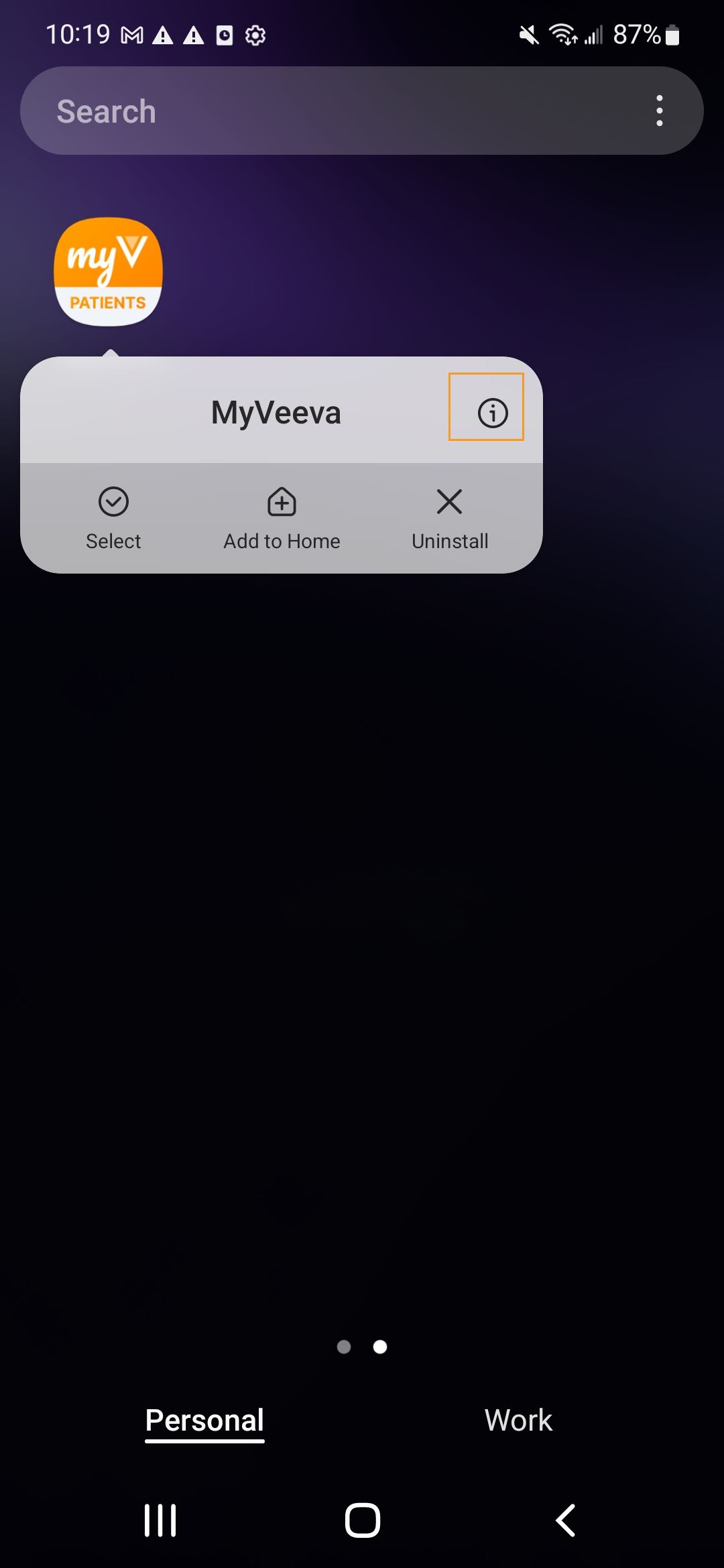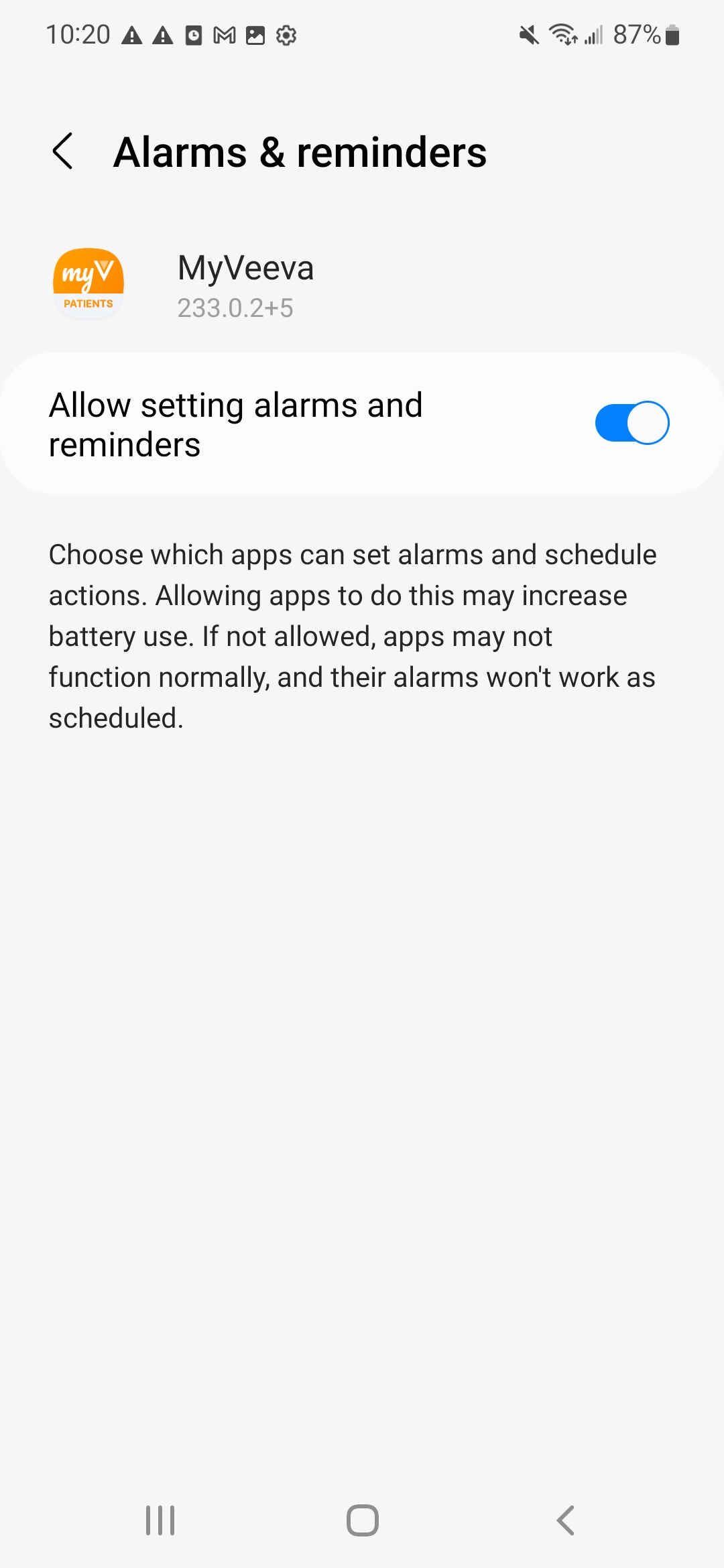 Użytkownik aplikacji MyVeeva for Patients może włączyć powiadomienia push na urządzeniach mobilnych i aktualizować ustawienia alarmów i przypomnień na urządzeniach z systemem Android.