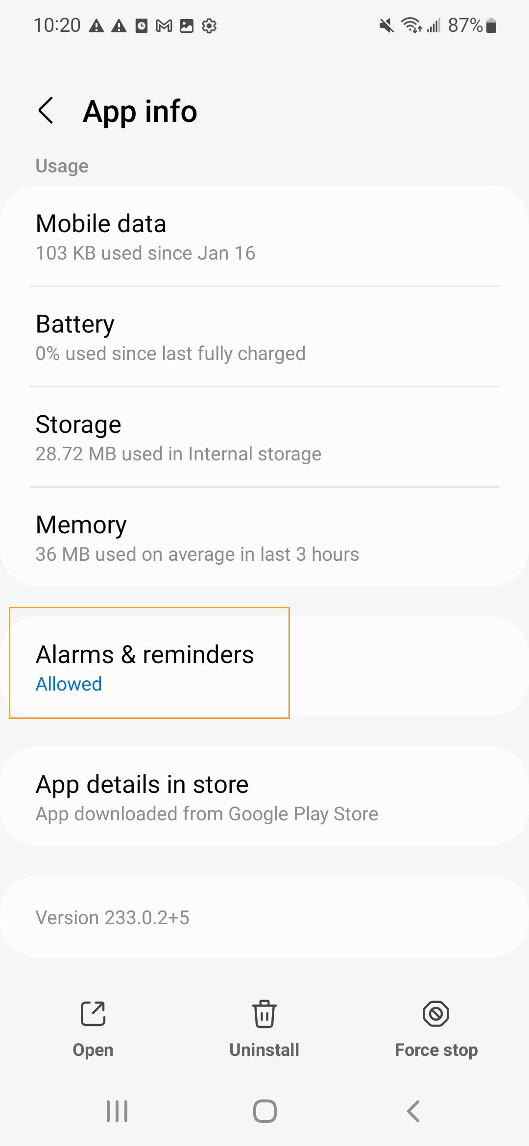 W niektórych urządzeniach z systemem Android należy włączyć funkcję Alarmy i przypomnienia, aby mieć pewność, że powiadomienia w telefonie będą wyświetlane i ostrzegać użytkowników o terminach wypełnienia ankiet, nadchodzących wizytach i innych ważnych informacjach.