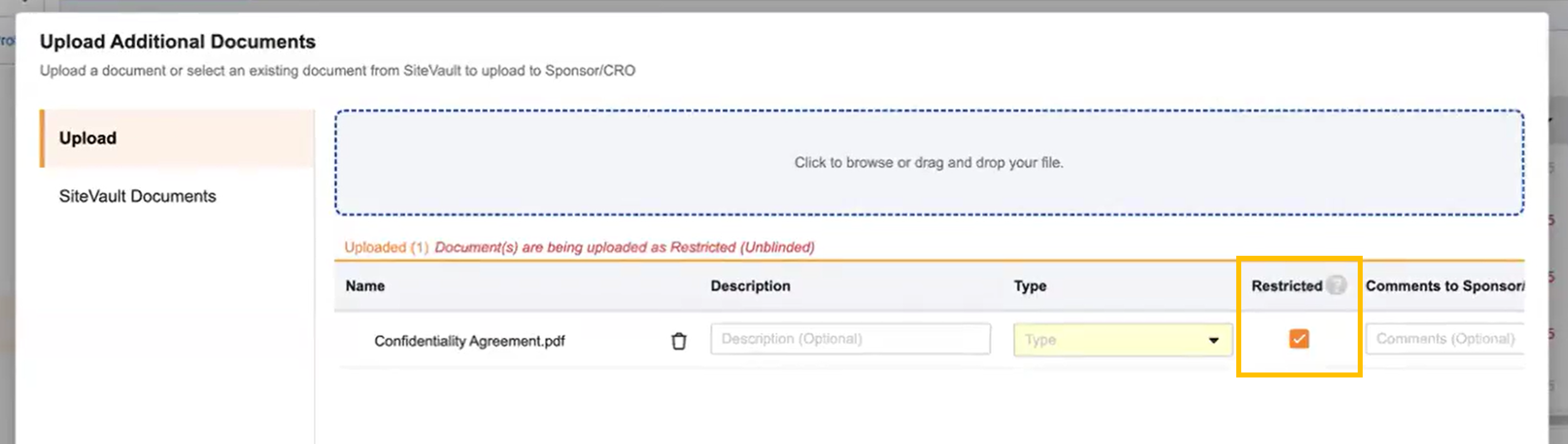 Funkcja „Ograniczone” ogranicza widoczność dokumentu do użytkowników lokacja, którym przyznano dostęp od Sponsora lub CRO. Gwarantuje to, że proces wymiany dokumentów może sprostać potrzebom badania zaślepionych lub maskowanych, mających na celu zapobieganie wprowadzaniu błędów systematycznych do wyników badanie.