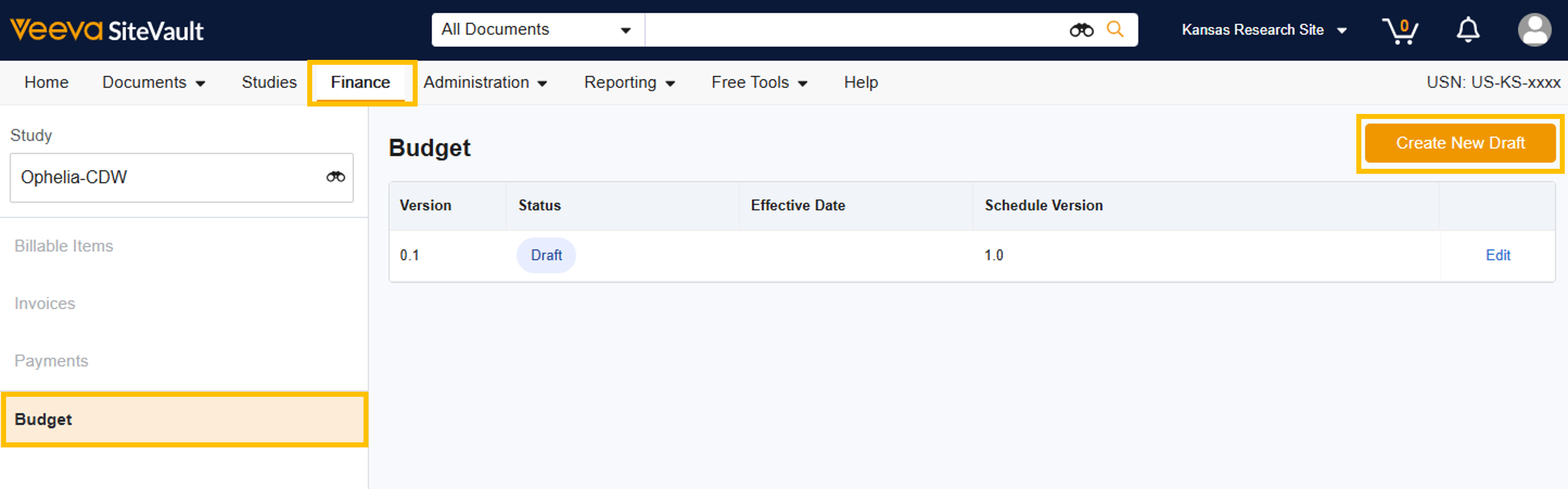 - Nowo utworzone budżety są powiązane z aktualną wersją harmonogramu badanie. Nie można utworzyć budżetu, dopóki nie będzie dostępna aktualna wersja harmonogramu badanie.