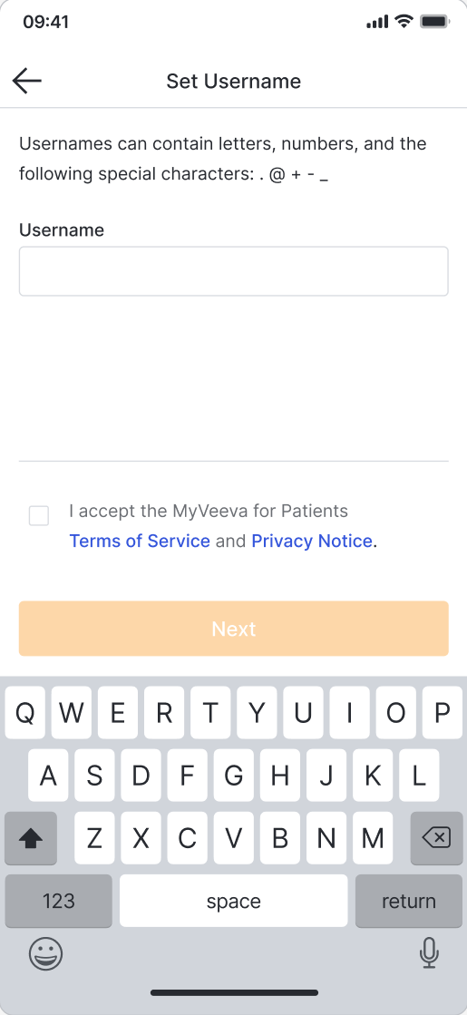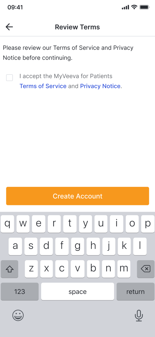 Użytkownik MyVeeva for Patients może utworzyć nowe konto, korzystając z kodu aktywacyjnego otrzymanego od zespołu badanie.