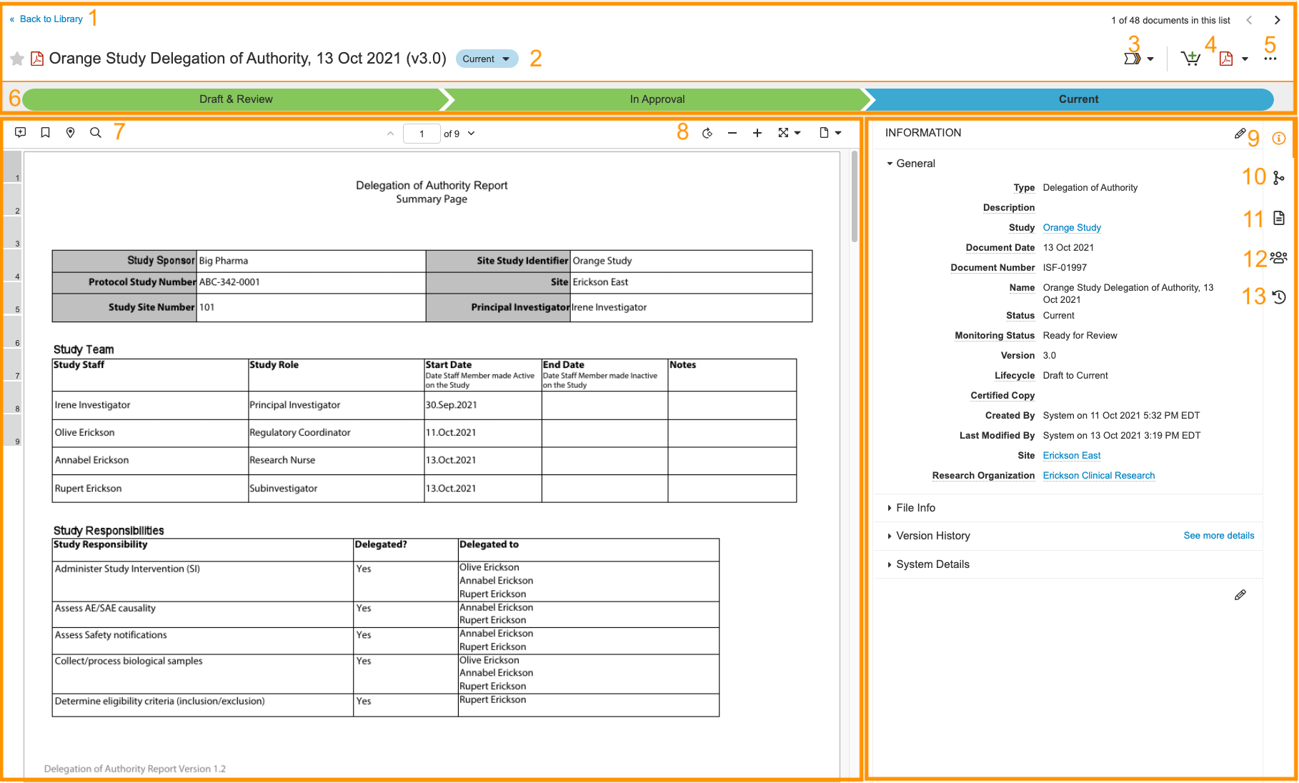 Strona Informacje o dokumencie wyświetla się po otwarciu dokumentu z karty Dokumenty > Badanie eBinder lub Dokumenty > Biblioteka. Strona Informacje o dokumencie wyświetla podgląd dokumentu wraz z wszelkimi powiązanymi informacjami. Na tej stronie można między innymi edytować informacje o dokumencie, inicjować przepływy pracy i zmieniać stan dokumentu. Więcej informacji o różnych obszarach i funkcjach strony Informacje o dokumencie można znaleźć w poniższej tabeli.