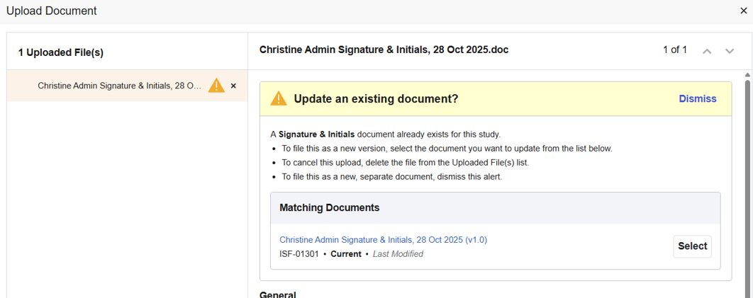 Gdy użytkownicy przesyłają (i klasyfikują) dokumenty do eBindera Badanie lub klasyfikują niesklasyfikowane istniejące dokumenty w eBinderze Badanie, system automatycznie sprawdza zgodność istniejących dokumentów, aby zmniejszyć prawdopodobieństwo przesłania duplikatów plików do eISF. Zapewnia to również bardziej spójny proces wersjonowania dla wszystkich użytkowników.