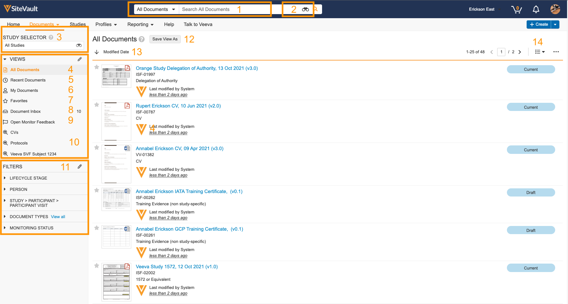 Segregator eBinder Badanie prezentuje dokumenty według badanie, pogrupowane według typu dokumentu, co pozwala na wgląd w ogólny postęp badanie i potrzeby dotyczące dokumentów. Większość czynności związanych z dokumentami można wykonać za pomocą Segregatora eBinder Badanie. Narzędzia eBinder zostały zaprojektowane specjalnie po to, aby oszczędzać czas i liczbę kliknięć podczas pracy nad konkretnym badanie.