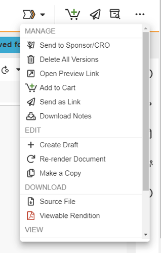 Pozycje menu są podzielone na cztery kategorie: Zarządzaj, Edytuj, Pobierz i Wyświetl. Każda sekcja zawiera listę działań, które można wykonać na wybranym dokumencie lub rekordzie.