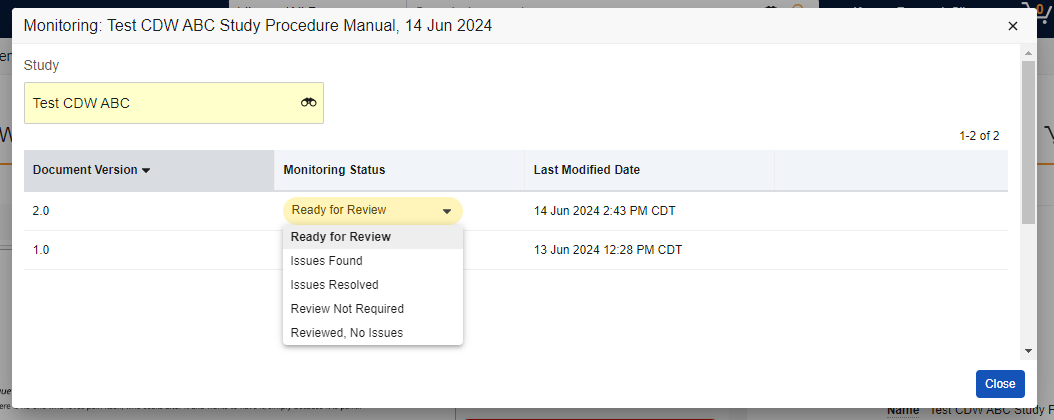 Przejdź do Dokumenty > Badanie eBinder i wybierz badanie w Selektorze Badanie. Wybierz folder Wszystkie dokumenty lub podfolder, aby wyświetlić podzbiór dokumentów. Aby filtrować widok według statusu monitorowania, wybierz jeden z następujących widoków kart: