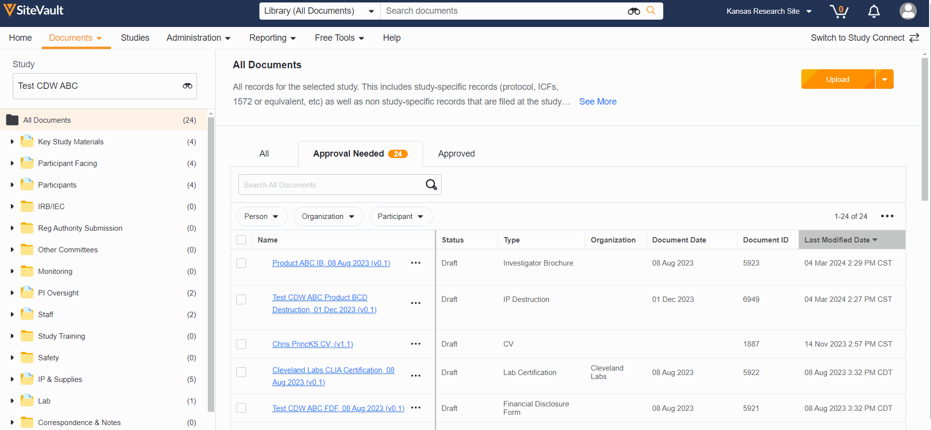 Chociaż Biblioteka zawiera WSZYSTKIE dokumenty, eBinder Badanie organizuje dokumenty według badanie, oferując pomocne widoki dla użytkowników wewnętrznych i zewnętrznych, skupiając się na postępach w badanie. eBinder Badanie to odpowiednik segregatora eRegulatory lub ISF z półki. Każdy folder reprezentuje zestaw dokumentów, a po rozwinięciu folderu można znaleźć każdy typ dokumentu dostępny do przesłania.