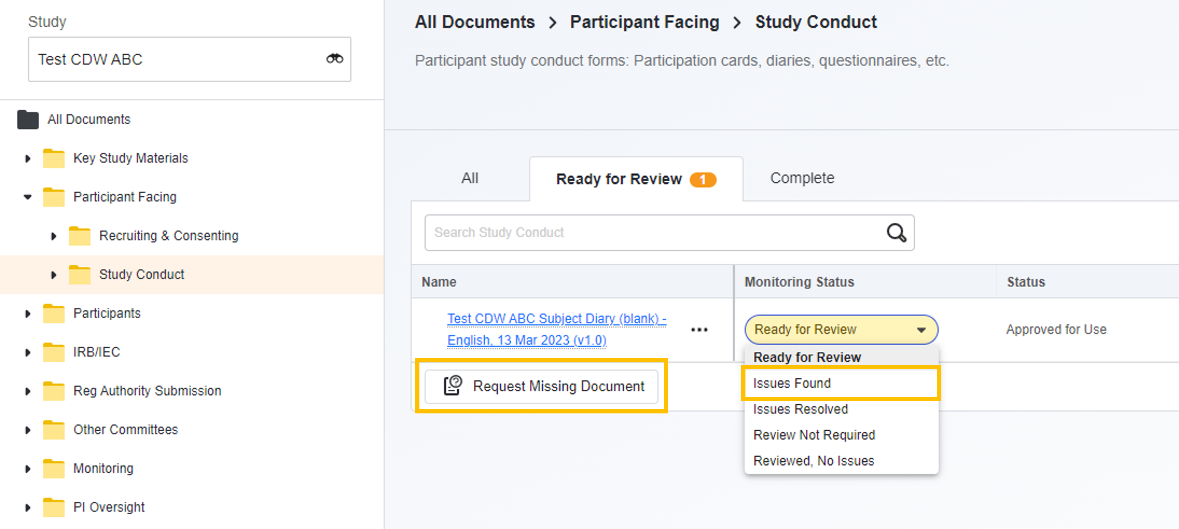 Przypisz dokumentowi status monitorowania znalezionych problemów lub, jeśli dokument brakuje, wybierz opcję Żądaj brakującego dokumentu.