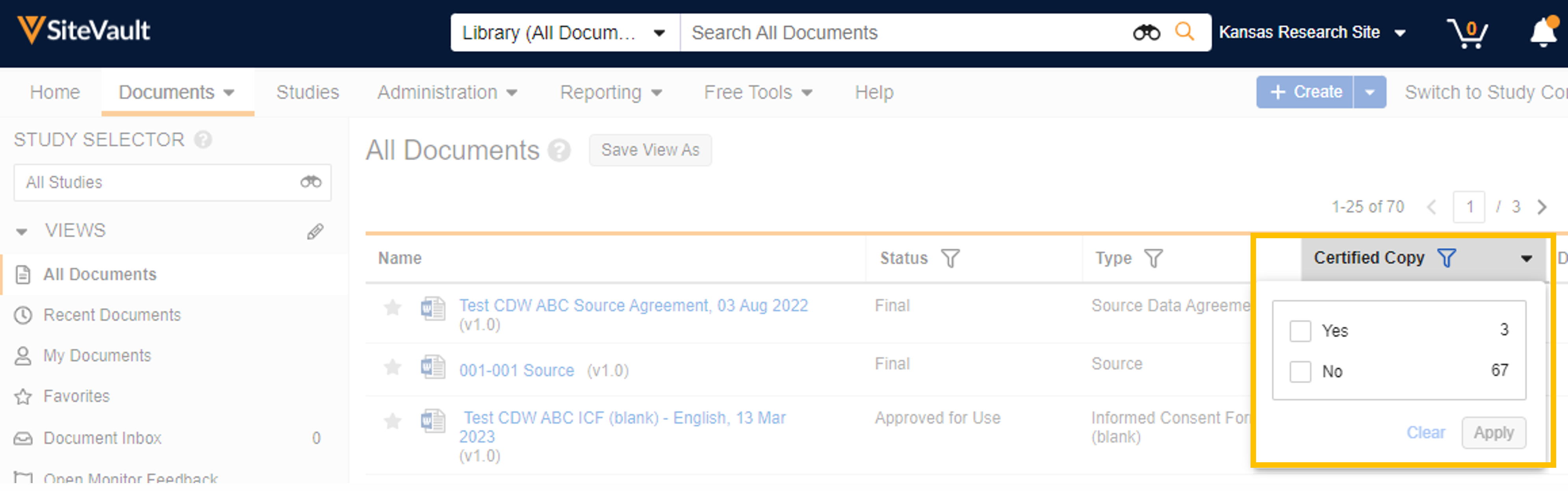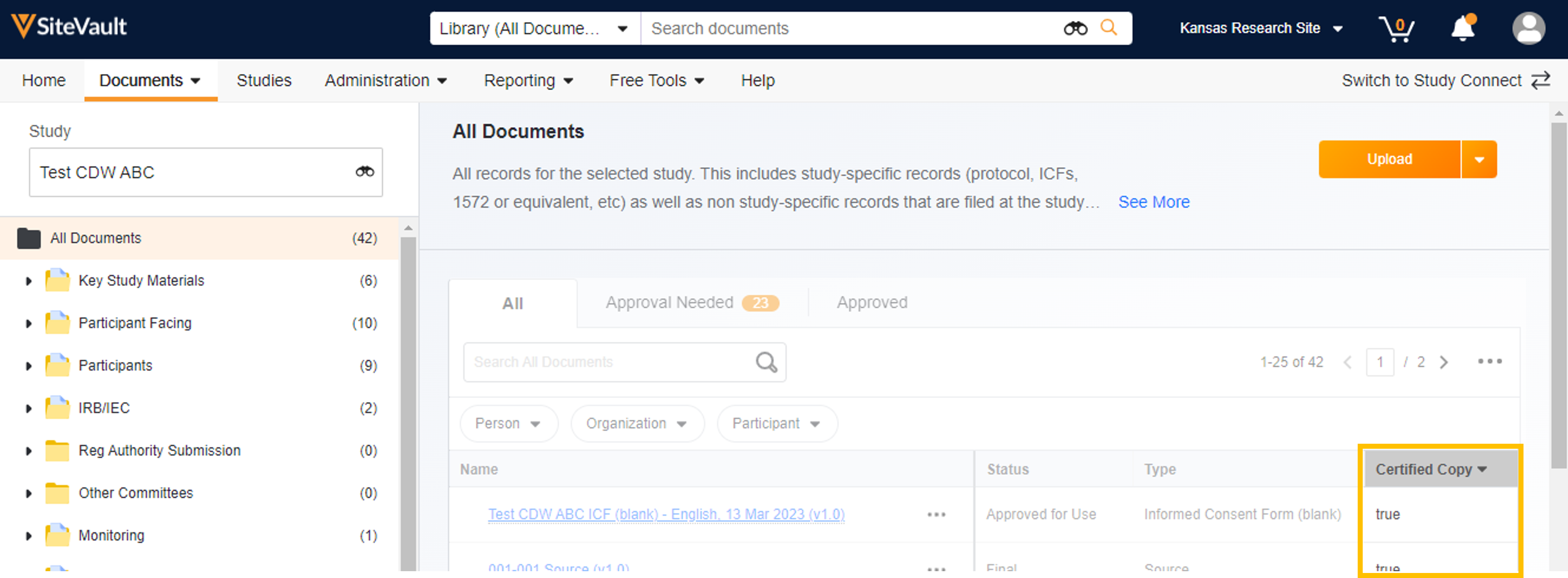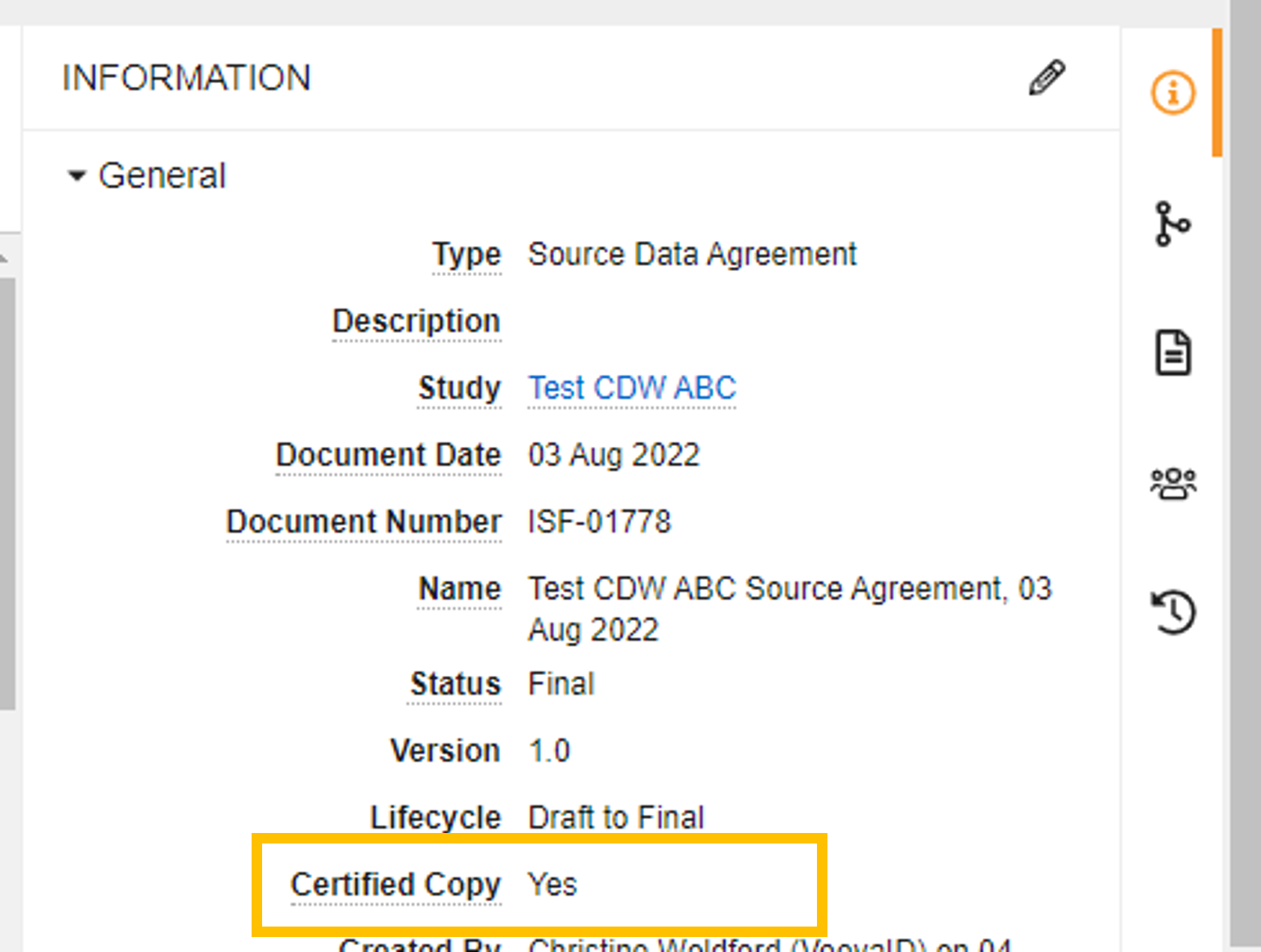SiteVault umożliwia klasyfikowanie dokumentów jako uwierzytelnionych kopii. Decyzja o tym, które dokumenty muszą być uwierzytelnione, należy do lokacja/organizacji. Dokument jest uznawany za kopię źródła, jeśli został pobrany ze źródła elektronicznego lub systemu elektronicznej dokumentacji medycznej (EDM) lub zeskanowany przed przesłaniem do SiteVault. Dokument jest uznawany za oryginalny dokument źródłowy, jeśli jest to plik, w którym dane zostały pierwotnie zarejestrowane (na przykład, jeśli plik.DOCX został wypełniony podczas wizyty).
