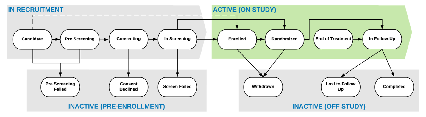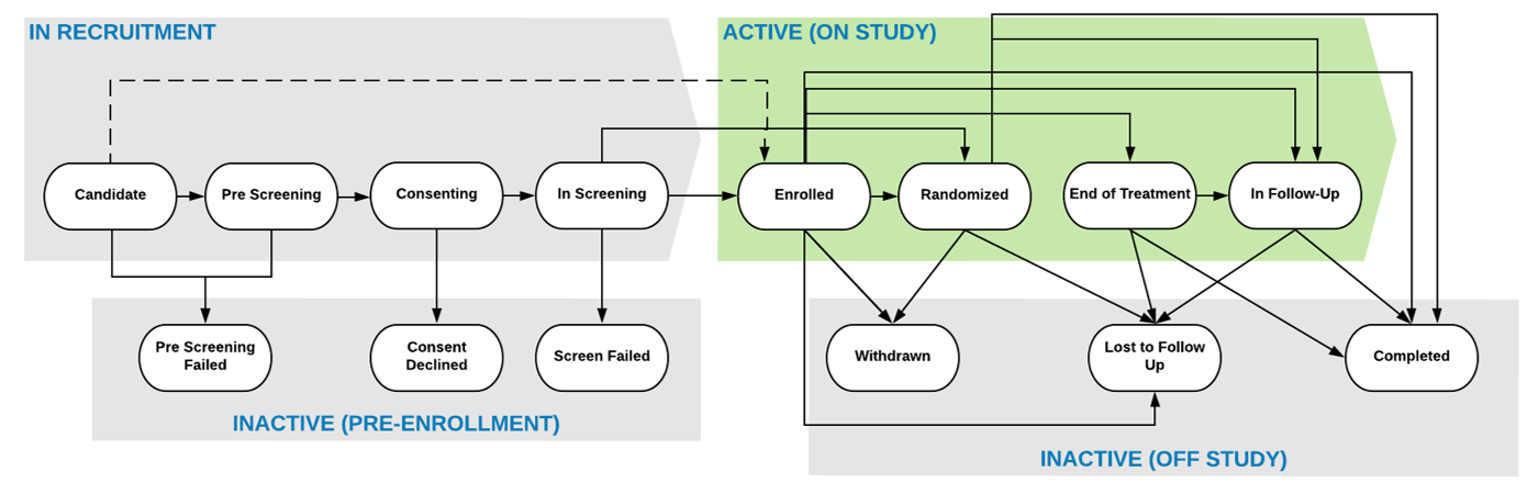 Cykl życia uczestnika umożliwia zarządzanie i śledzenie statusu uczestnika w trakcie badanie. Po utworzeniu rekordu uczestnika, jego początkowy status to „Kandydat”.