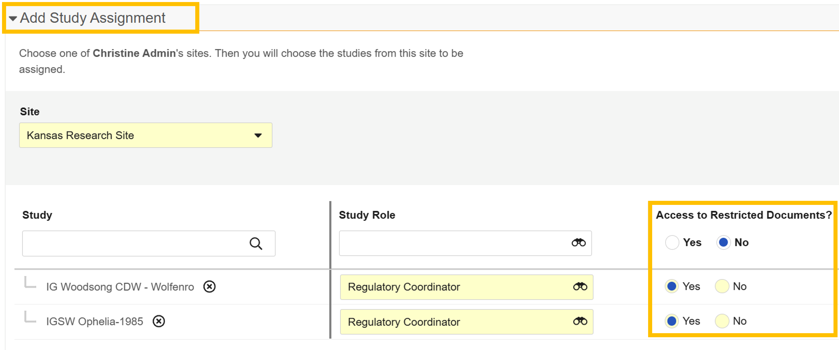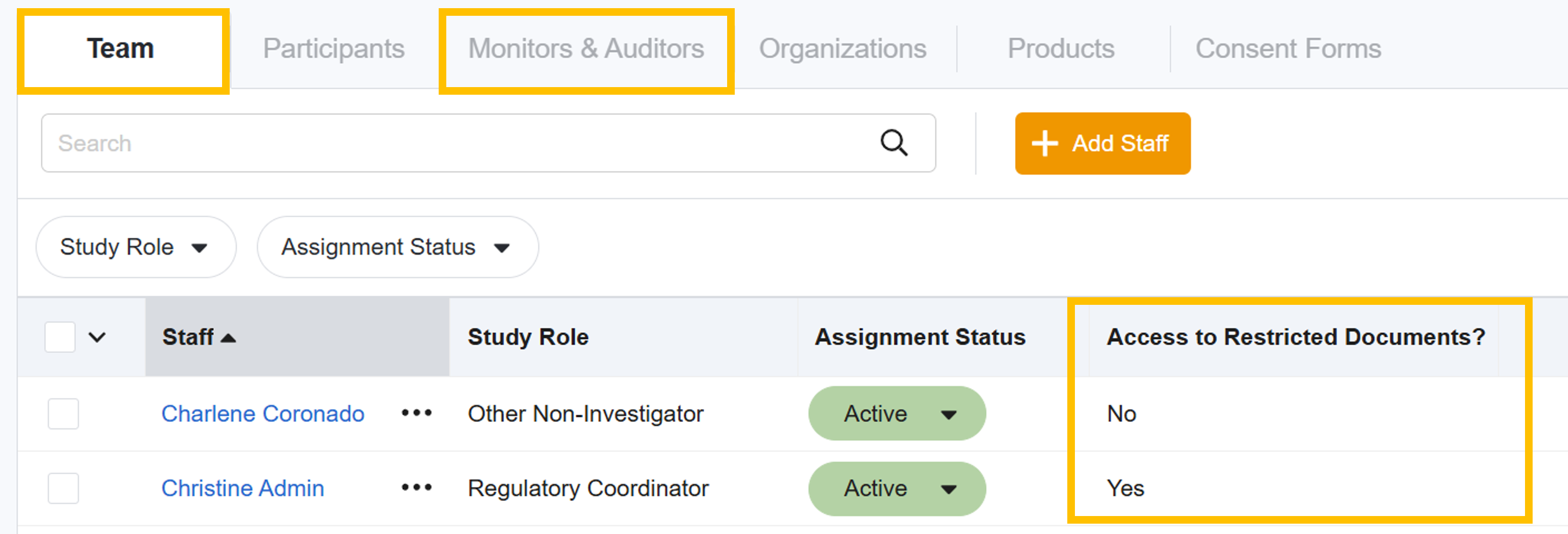 - Administratorzy mogą przyznać lub cofnąć dostęp do dokumentów zastrzeżonych członkowi personelu badanie (w tym sobie) lub monitorować/użytkownikowi zewnętrznemu. Przyznanie/cofnięcie dostępu zastrzeżonego musi być dokonane dla każdego użytkownika i dla każdego badanie.
