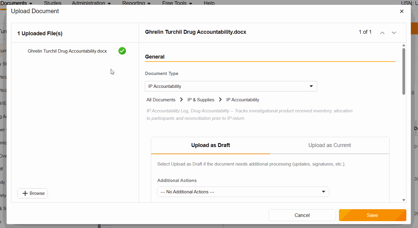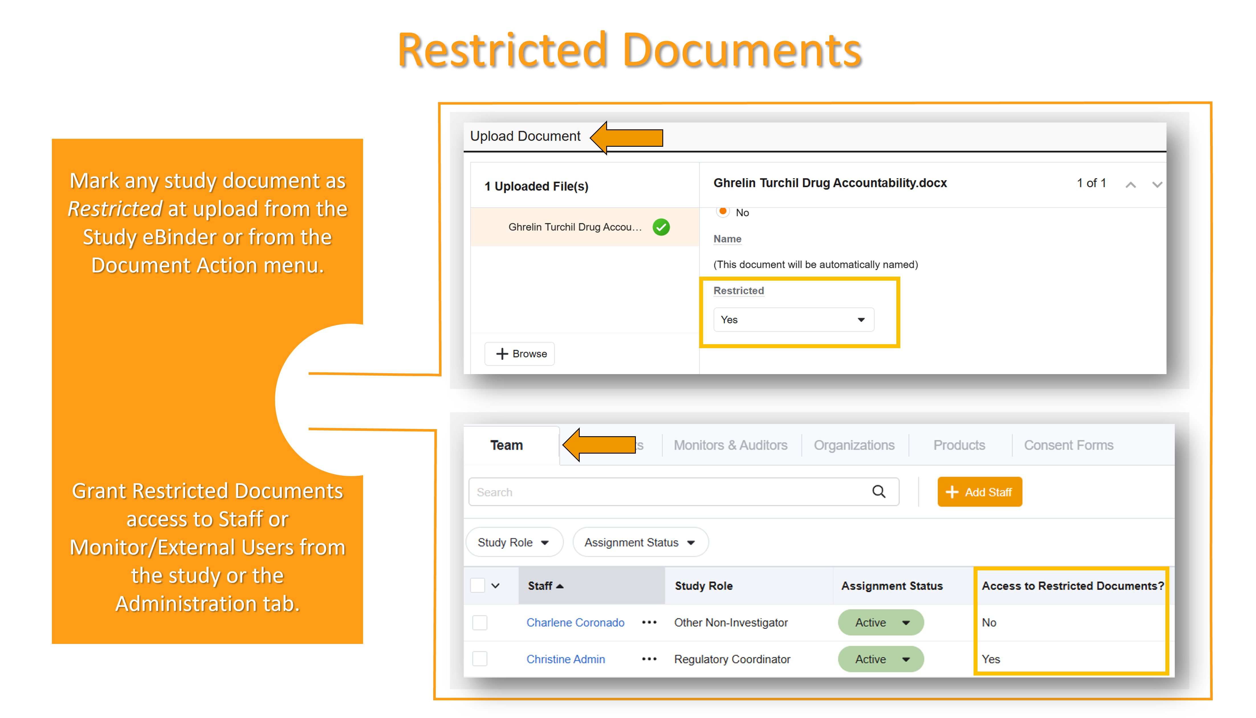 Funkcja „Zastrzeżone dokumenty” pozwala lokacje ograniczyć widoczność dokumentów do określonych użytkowników przypisanych do badanie. Funkcja ta jest przeznaczona do badania zaślepionych/maskowanych, w których pewne dokumenty (np. informacje o randomizacji) muszą pozostać ukryte przed całym zespołem badanie. Ograniczanie dostępu do dokumentów i personelu to dwuetapowy proces, który obejmuje najpierw oznaczenie poszczególnych dokumentów badanie jako „Zastrzeżone”, a następnie udzielenie dostępu do nich poszczególnym członkom personelu badanie. Tylko członkowie personelu badanie z dostępem do dokumentów „Zastrzeżone” mogą przeglądać dokumenty badanie oznaczone jako „Zastrzeżone”.
