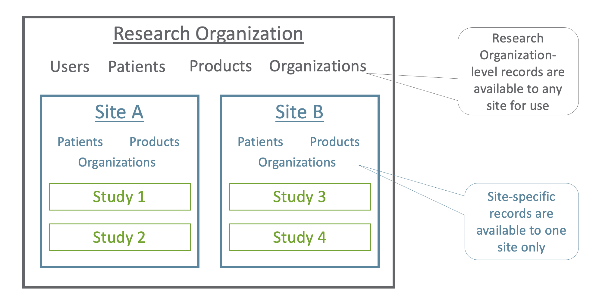 Role i dodatki systemowe opierają się na sposobie strukturyzacji informacji w SiteVault, gdzie dokumenty i dane mogą istnieć na poziomie organizacji badawczej, lokacja lub badanie.