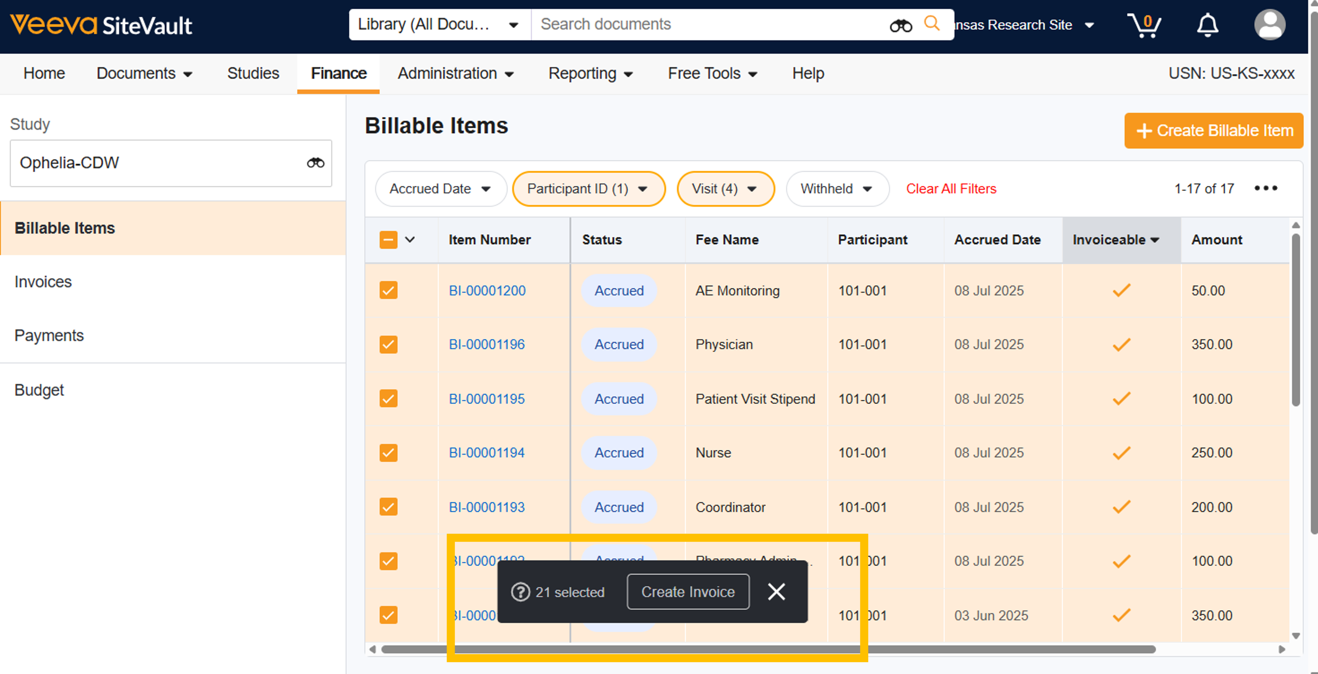 Embora o SiteVault ofereça itens faturáveis detalhados, os patrocinadores geralmente exigem que as faturas sejam agrupadas (por exemplo, por paciente, por consulta ou como um resumo). Utilize o recurso de exportação para manipular os dados e atender aos requisitos de faturamento específicos do patrocinador.