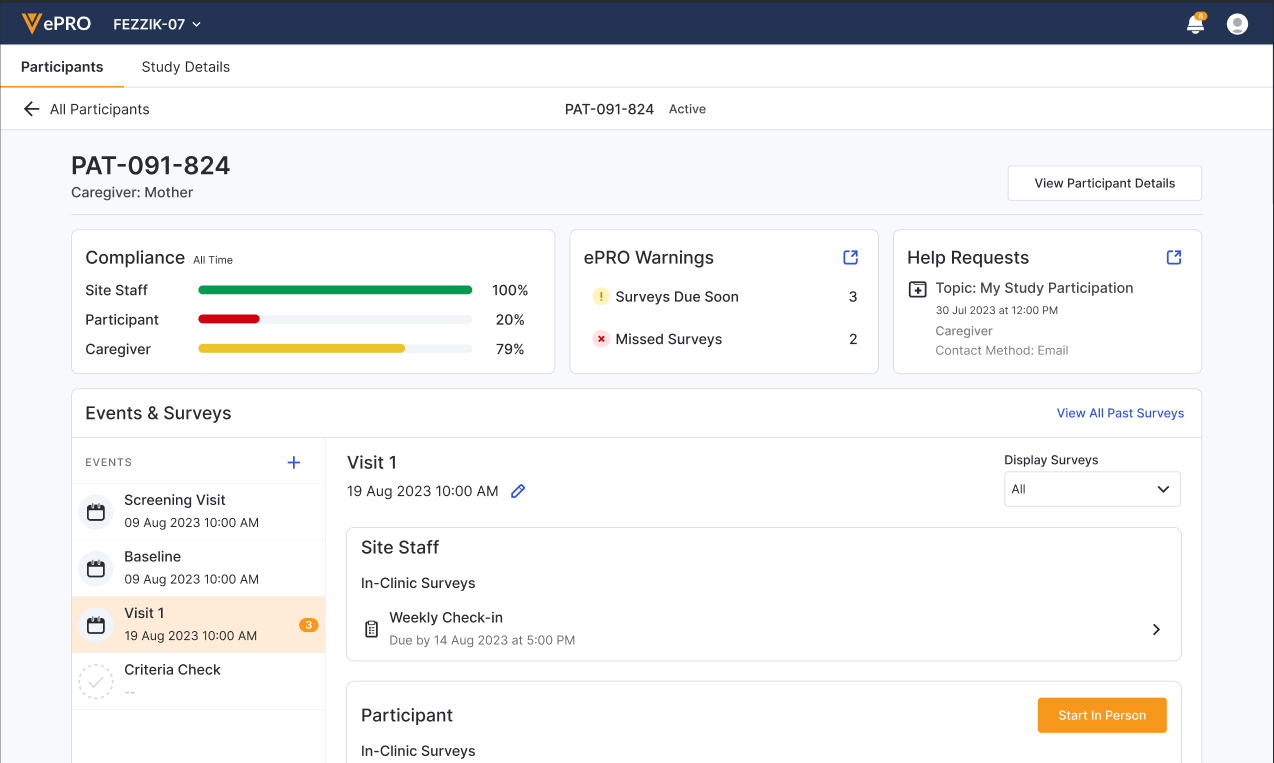 Все участники исследования отображаются в списке «Участники». Вы можете увидеть общую информацию, включая информацию о соблюдении требований и запросах на помощь. На этой странице также можно добавлять новых участников.
