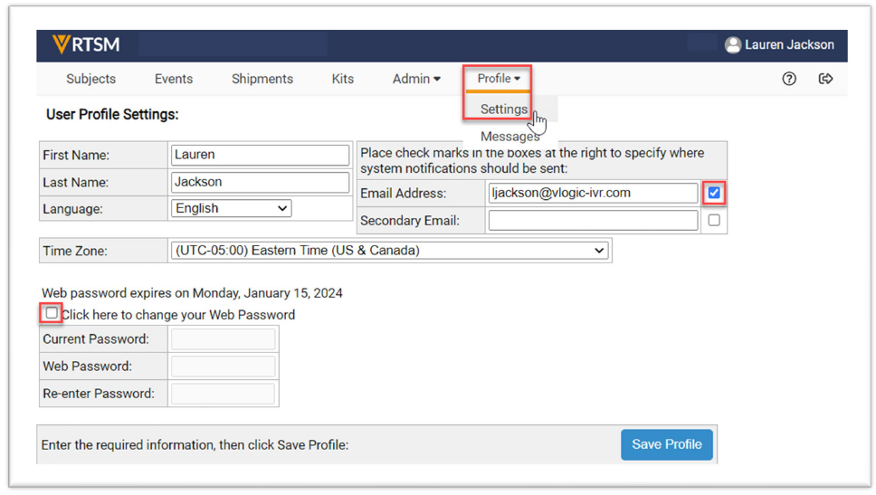 Примечание: Редактируемые поля в профиле пользователя зависят от версии RTSM, используемой в вашем исследовании. Для пользователей версии 23r1 и выше см. первый пример. Для пользователей версии 4 или более ранних версий см. второй пример.