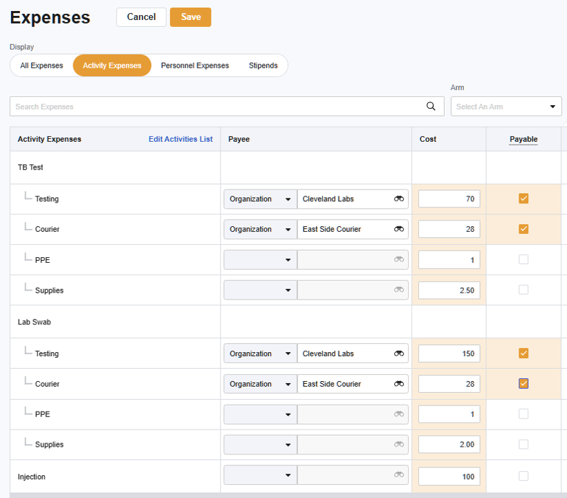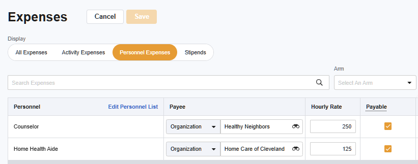After you’ve added expenses, you can edit their costs (amounts). For an Activity expense, the cost is applied uniformly to each Visit that uses that Activity. For Personnel and Stipend expenses, cost can be specified per Visit.