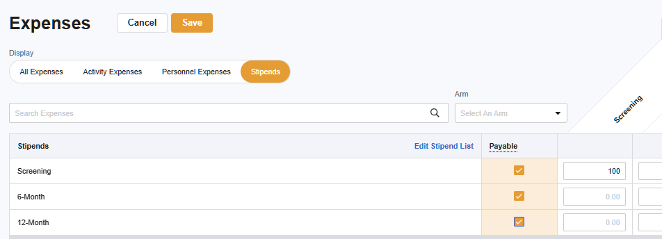- Select +Create Stipend to add stipends related to visits that when completed, have an associated cost for your site.