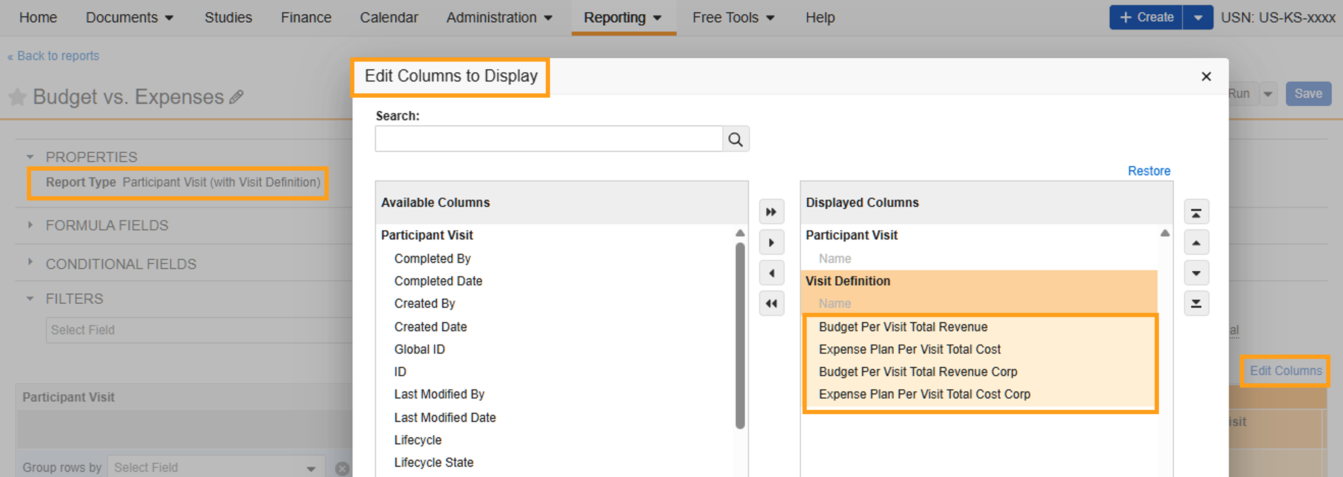 From the Reporting tab, create a report with the type Participant Visit (with Visit Definition). Add the following columns to the report: