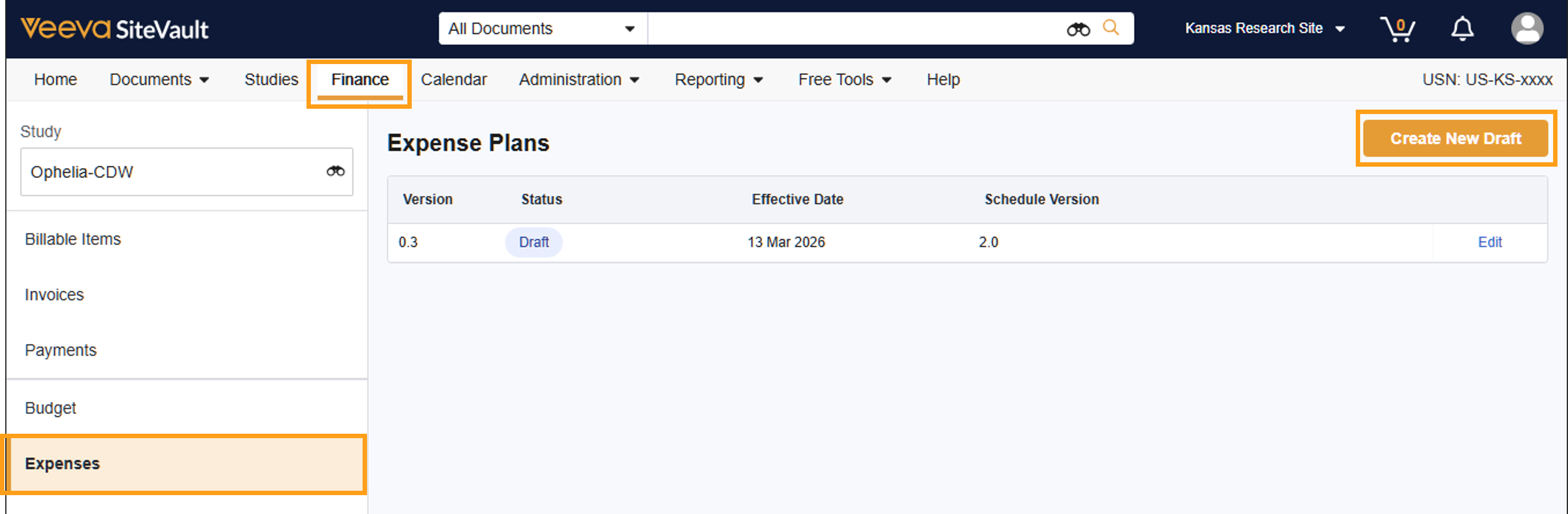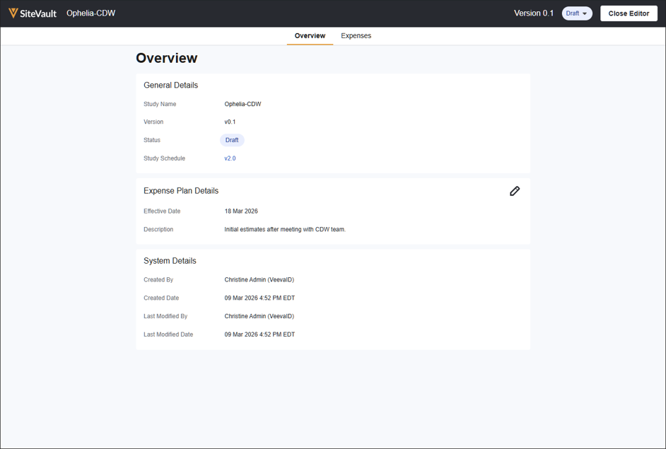 - Schedules, Budgets, and Expense Plans are versioned independently; if a schedule change impacts the costs and expenses associated with the study, you should update the Expense Plan.