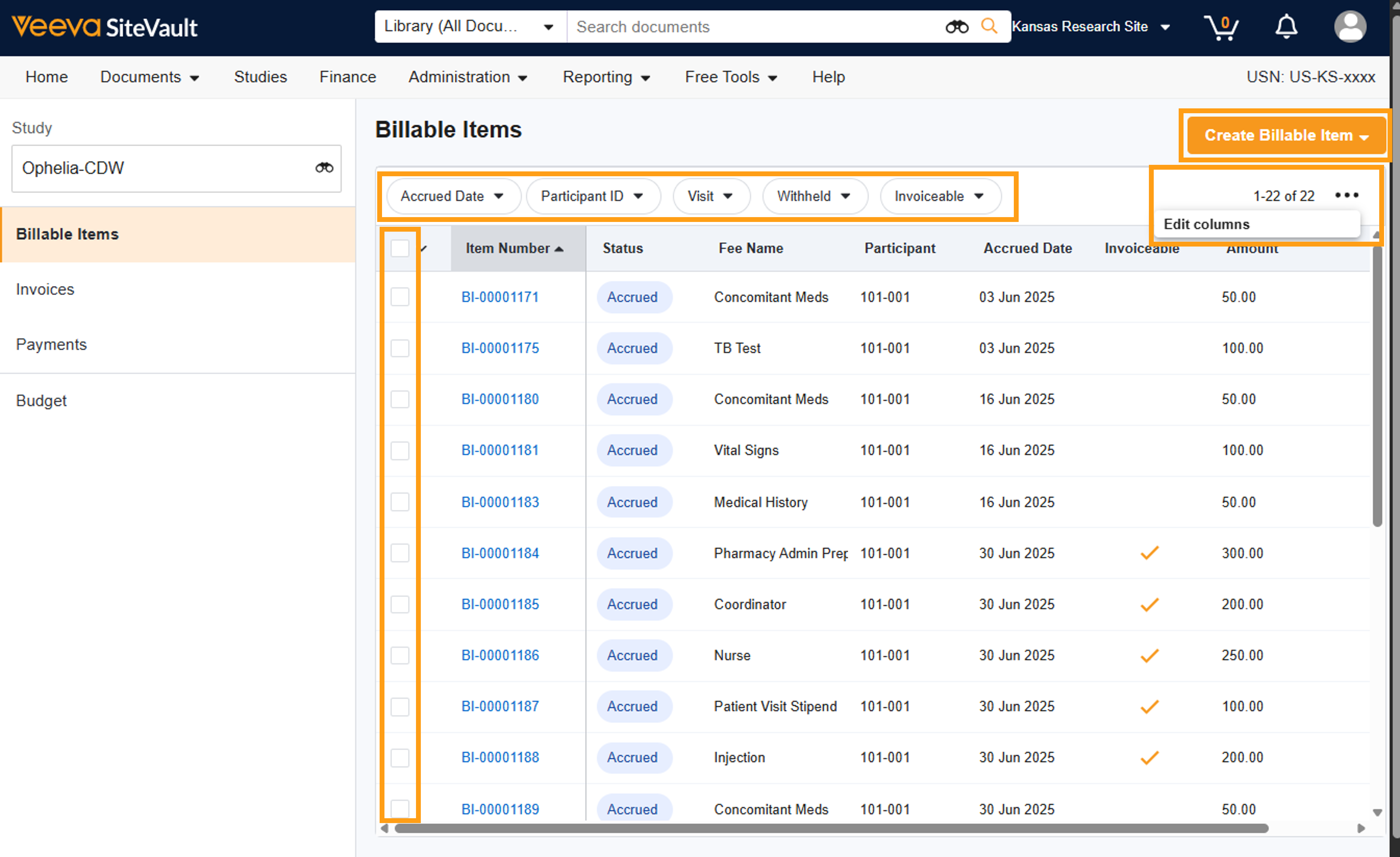 - The table displays billable items, including accrued date, participant ID, visit, and withheld amounts (if applicable).