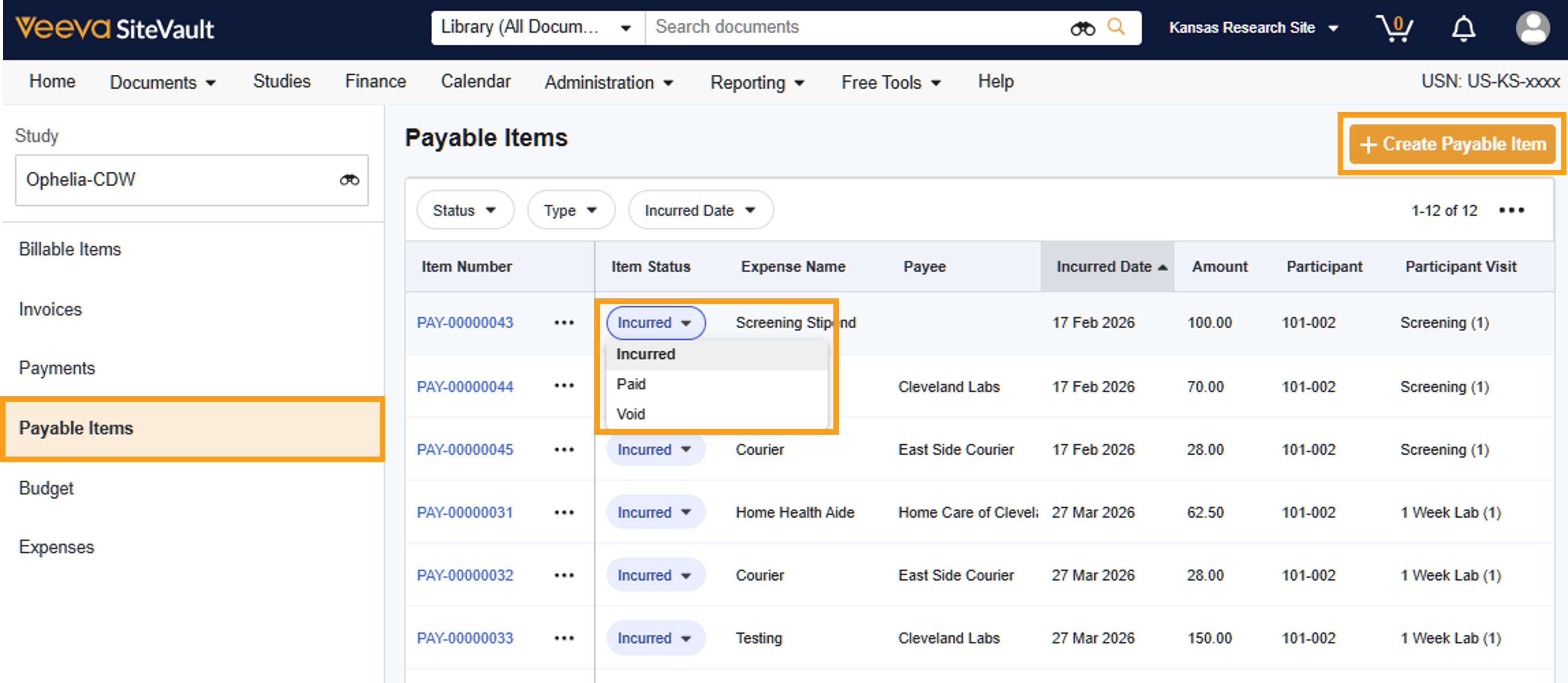 - Mark as Void if an item was generated in error (ex. if a lab test was cancelled or a participant was ineligible for a stipend due to a canceled visit). This removes the item from your active payable items without deleting the record, maintaining a clear audit trail.