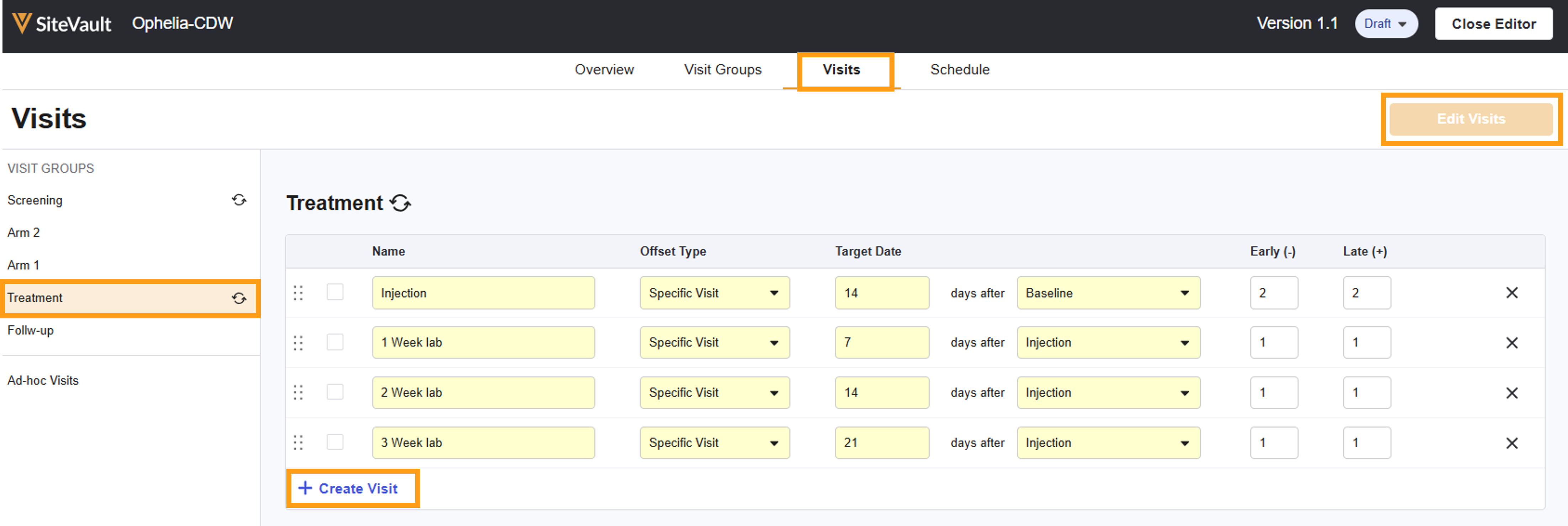 - Within the Schedule Editor, navigate to the Visits tab. Your defined groups/phases are listed on the left.