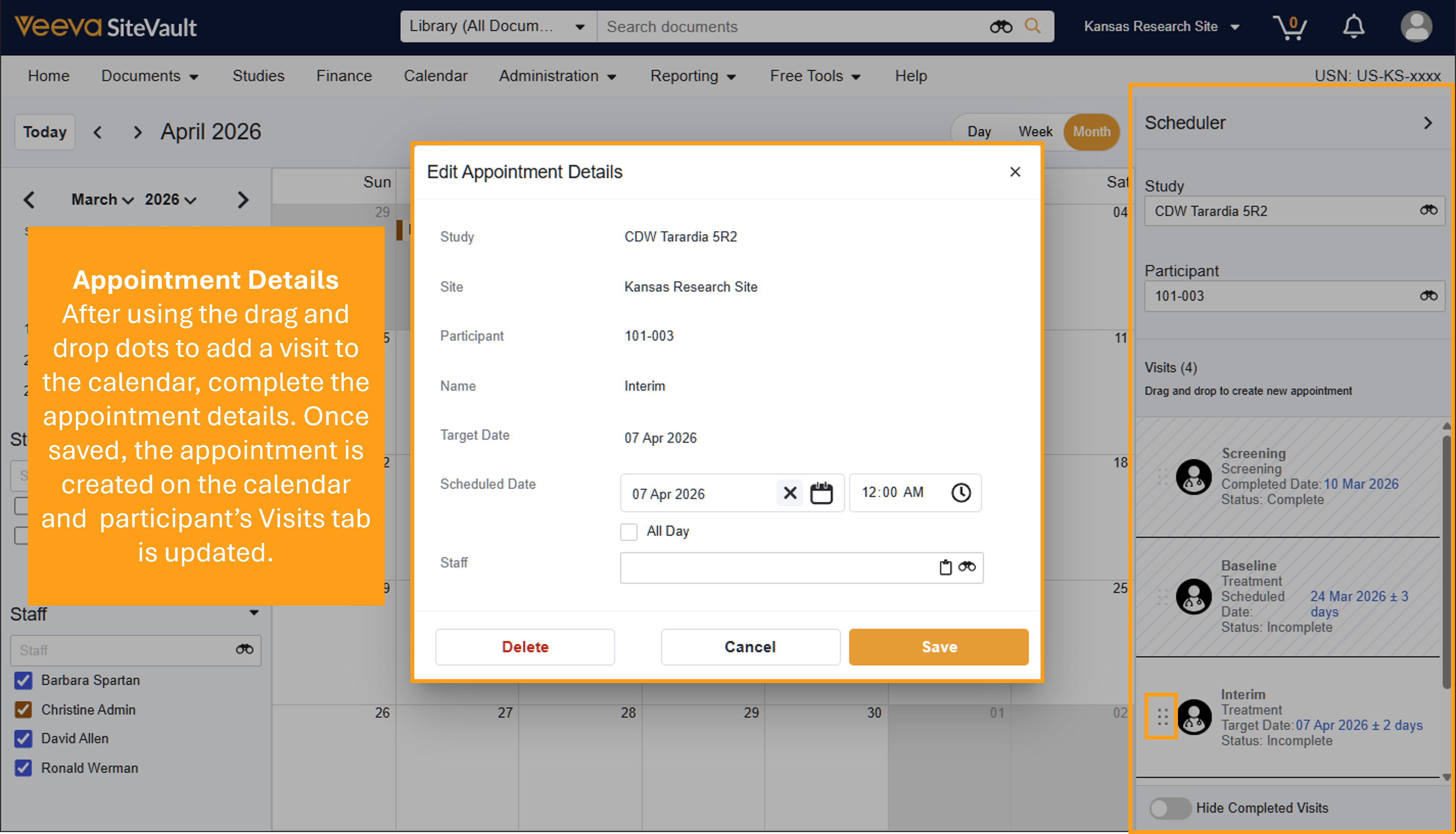 You can delete an appointment from the calendar or from a participant’s Visit tab in the study.