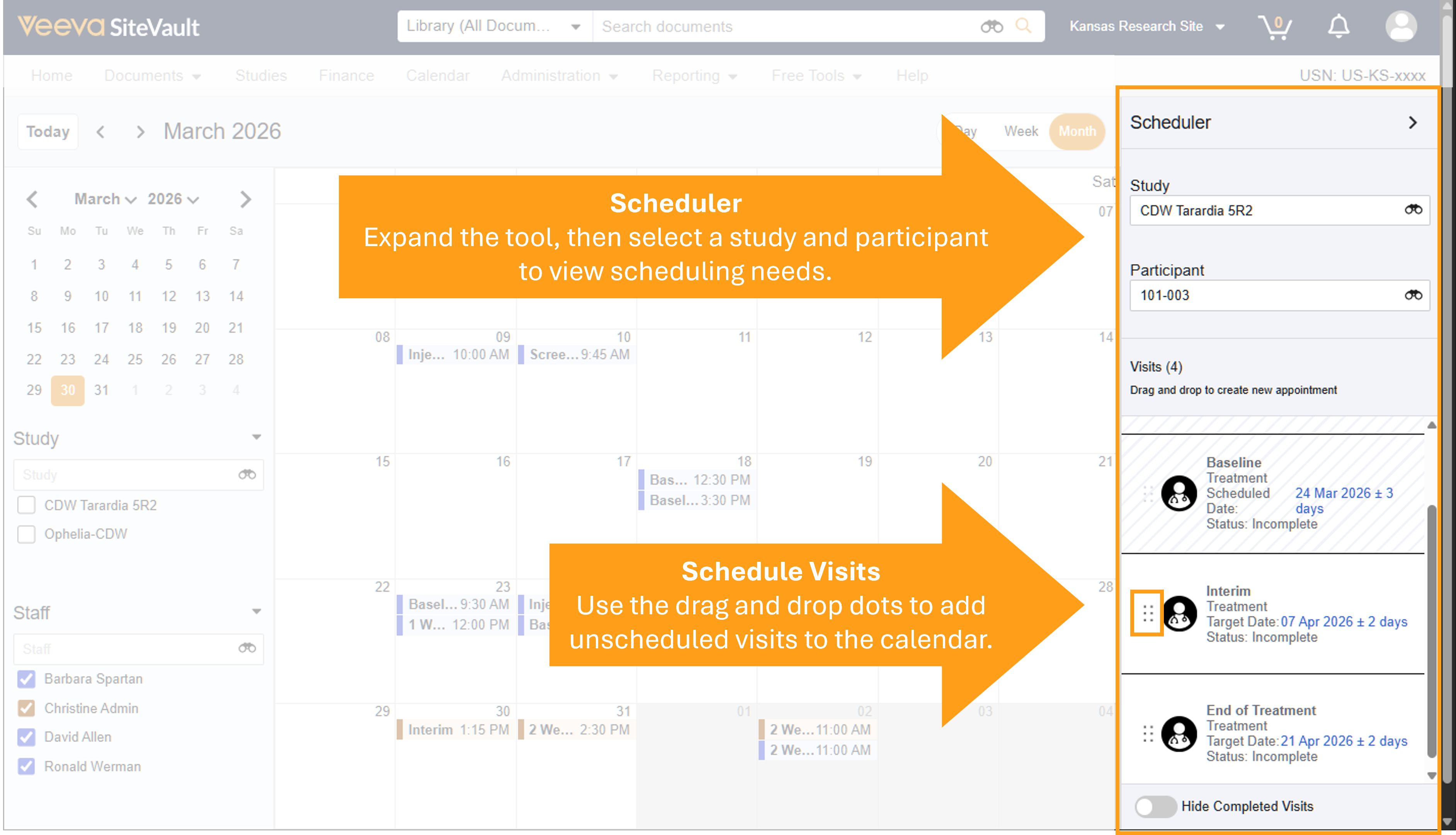 The Scheduler tool in the right panel provides all you need to schedule participant visits for any study. When accessed from Study > Participants > Visits > Scheduling Calendar, the calendar opens prefiltered to the participant’s information.