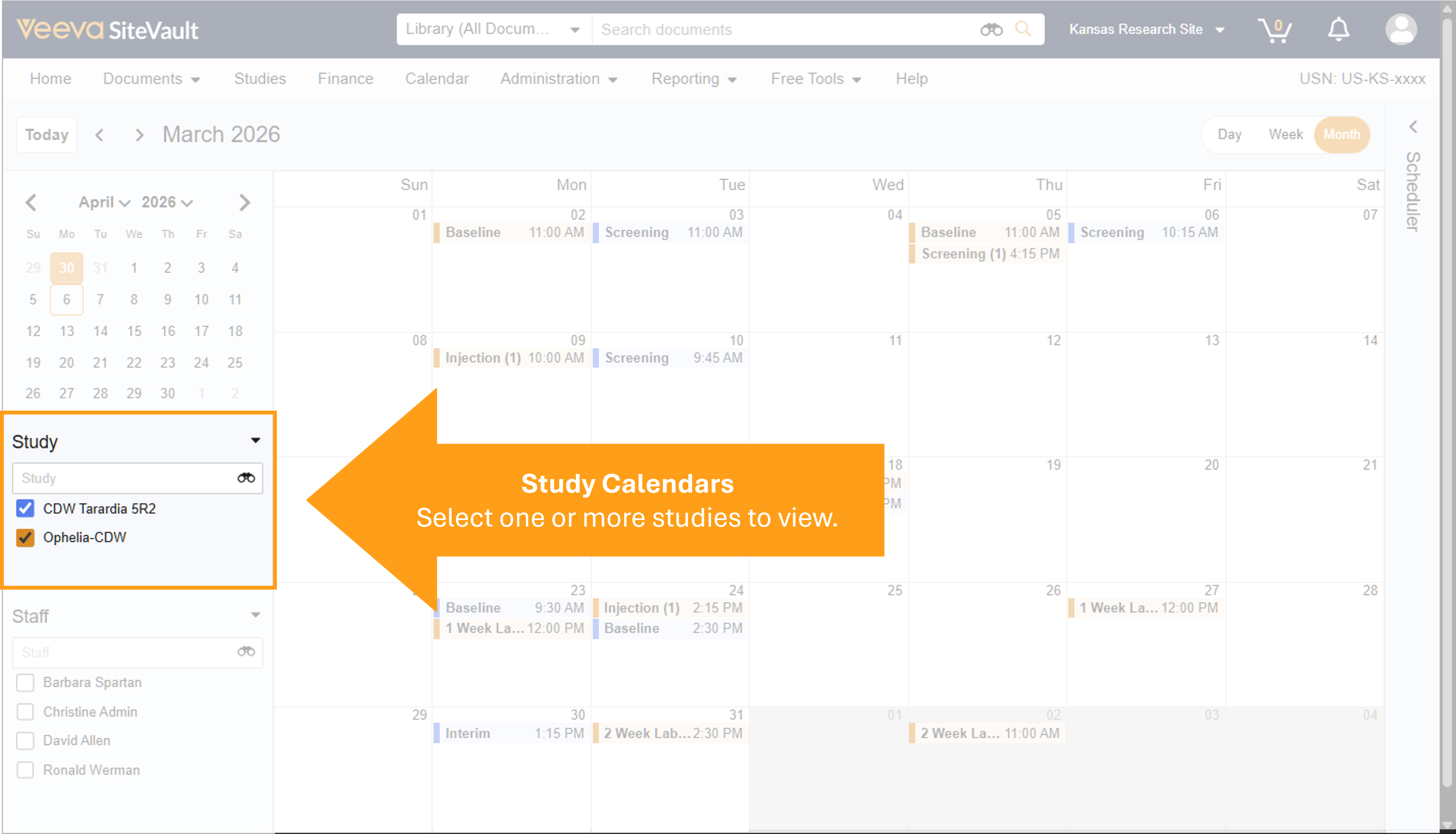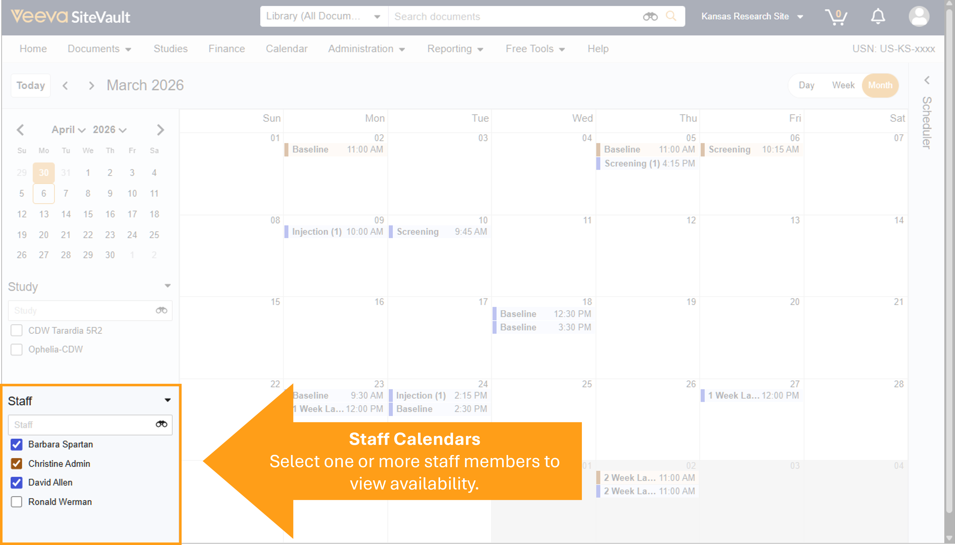 The Calendar provides a centralized view of upcoming participant appointments and their assigned resources. At a glance, you can view study activity and staff availability, as well as create and edit participant visits.