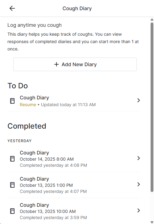 Коли учасник вибирає щоденник, відкривається сторінка, де користувач може додати новий запис у щоденнику, продовжити поточний запис або переглянути завершені записи (якщо це налаштовано спонсором).