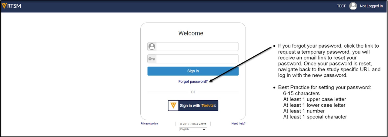 注意: 创建 VeevaID 帐户后,返回RTSM URL,使用Veeva ID 按钮登录。