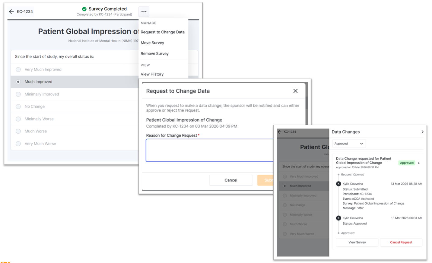 当数据更改功能关闭或更改期限已过时,您可以提交任何调查的数据更改请求。申办方/CRO 将审核、批准或拒绝这些请求。数据更改请求获得批准后,您即可对相关调查进行更改。